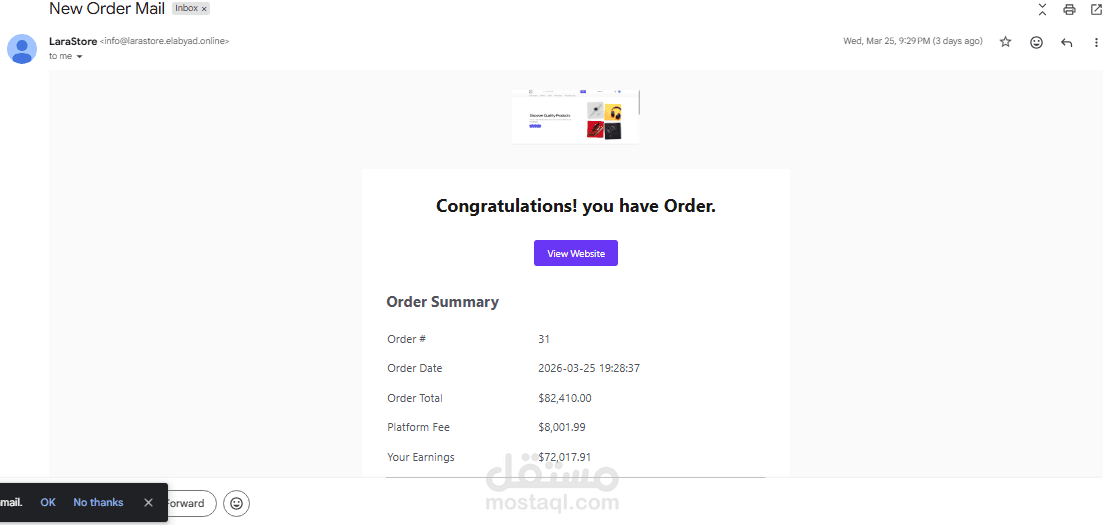 ✅ إيميل للبائع عند كل طلب جديد — بيتضمن إجمالي الطلب والعمولة وصافي الأرباح