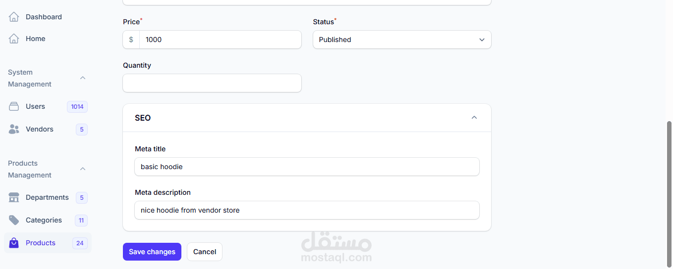 ✅ إدارة المنتجات — إنشاء وتعديل مع الصور والمتغيرات وحقول الـ SEO