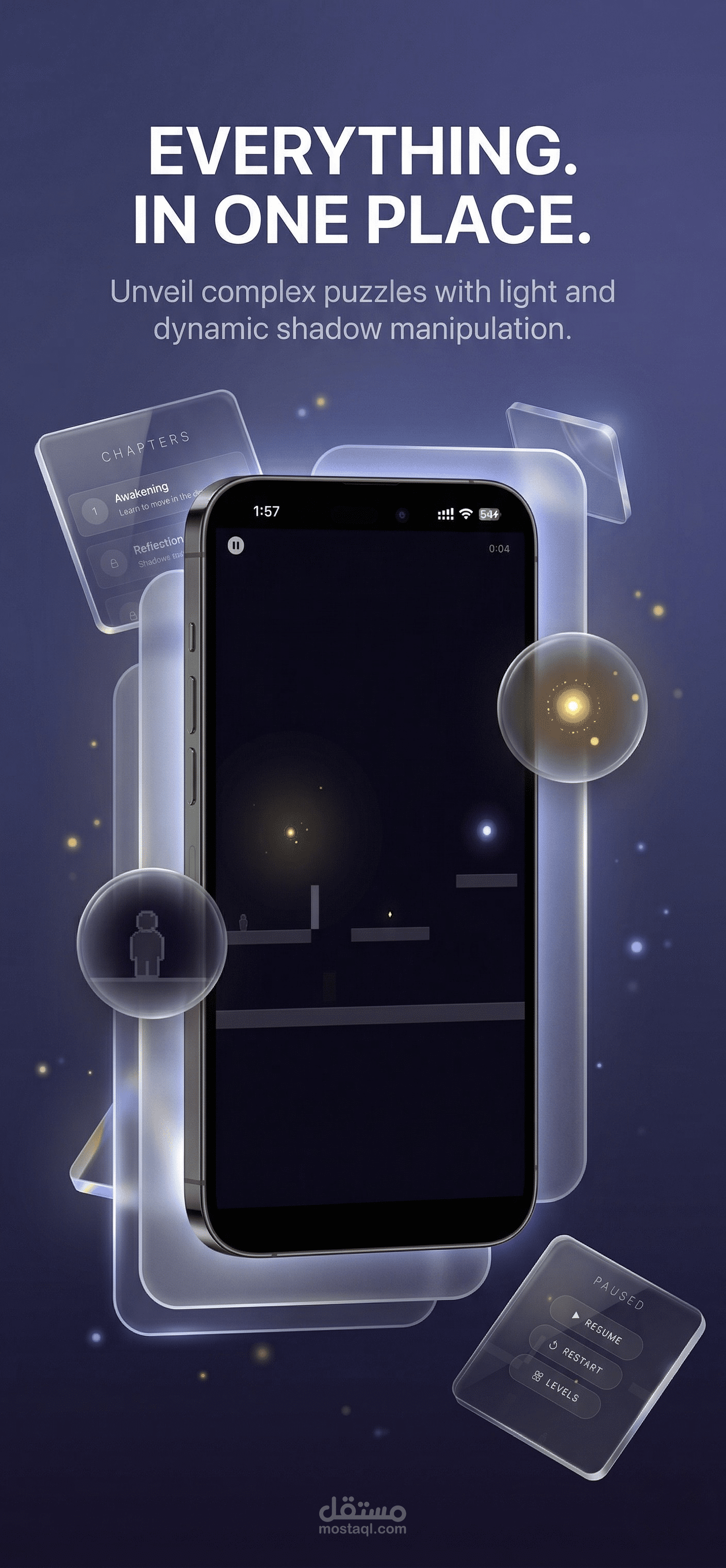 Each level introduces new ways to think about light and shadow. Cast bridges across chasms. Create staircases from nothing. Unlock doors that only shadows can open. As you progress, the story unfolds through poetic fragments—echoes of a world that once was.