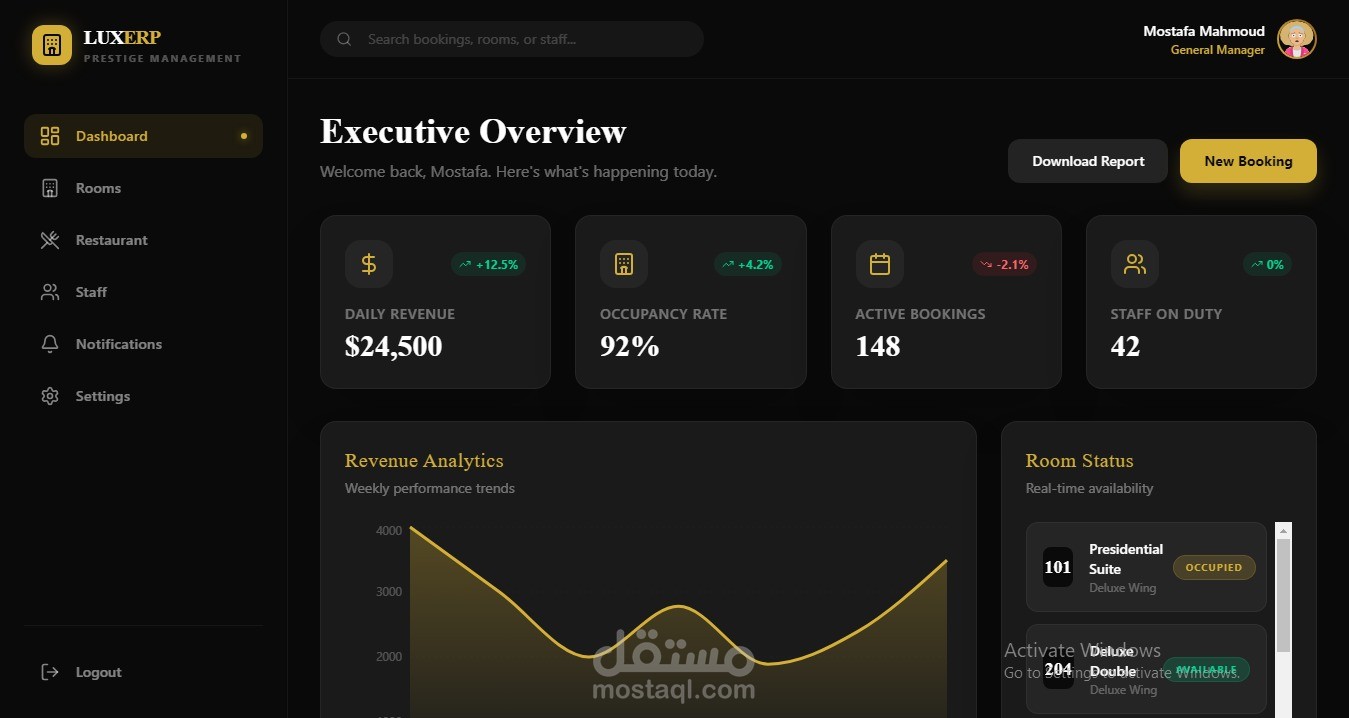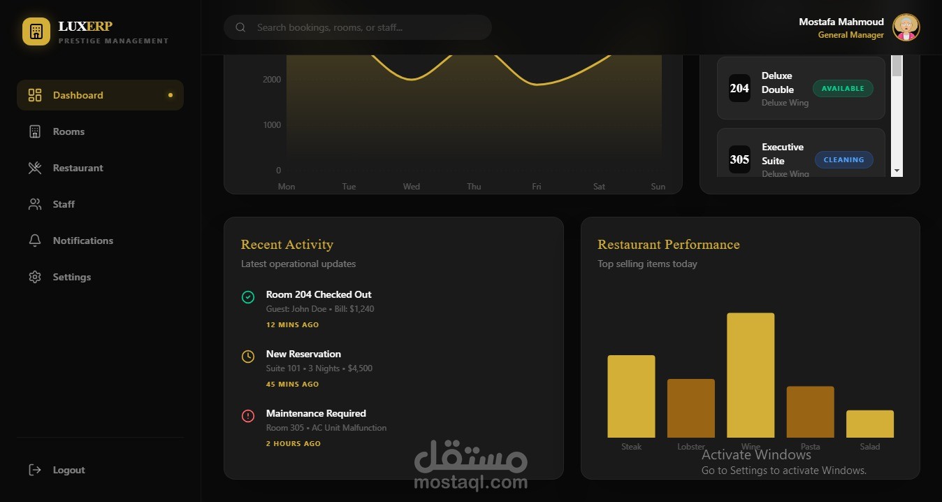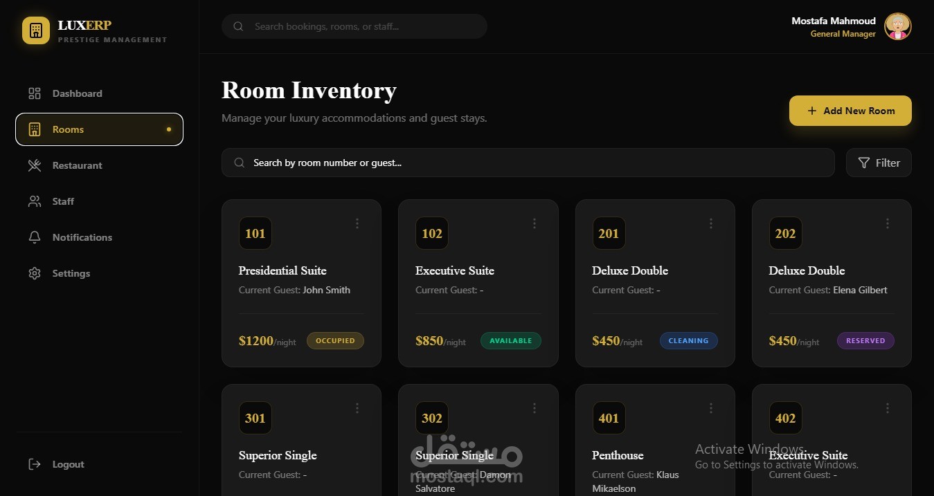 A hotel system that includes the number of rooms, their booking, the number of guests, and their management; it's a complete system for a hotel and its management, including the kitchen.