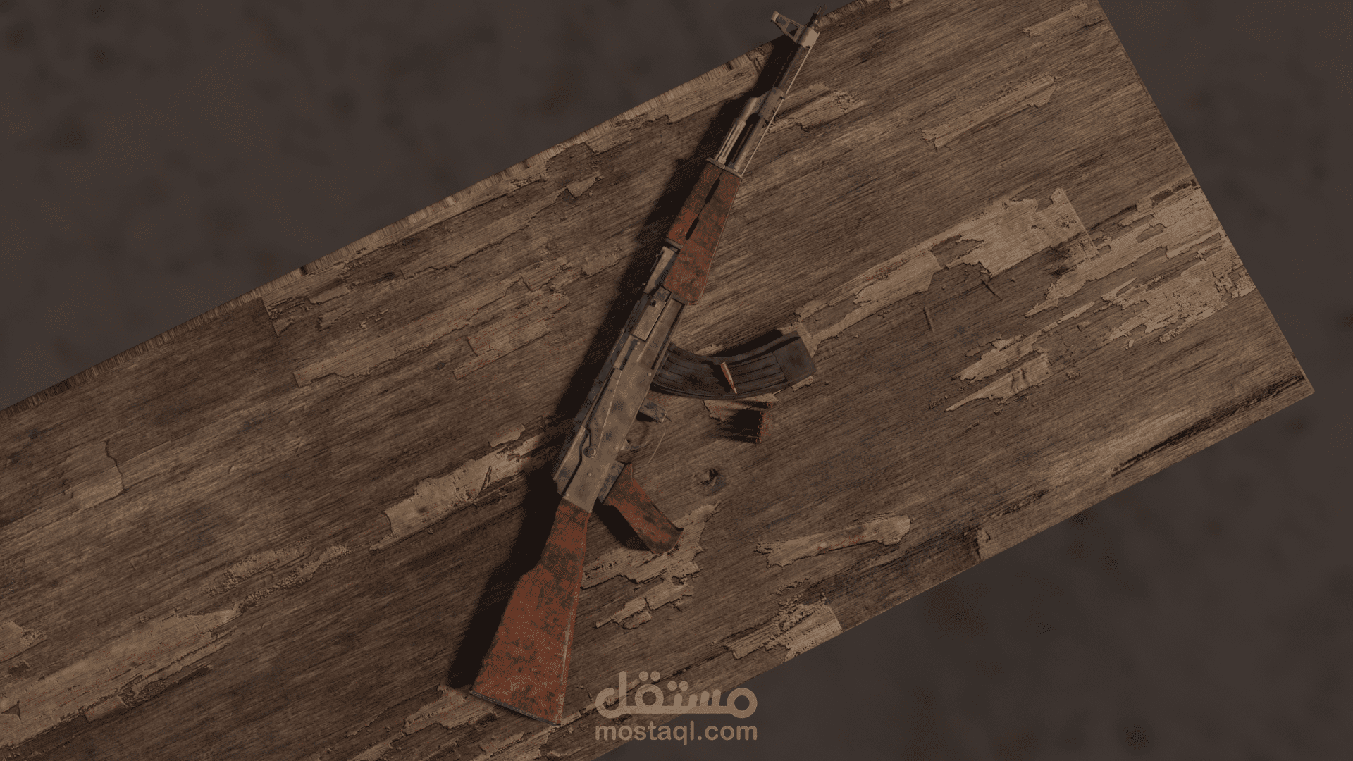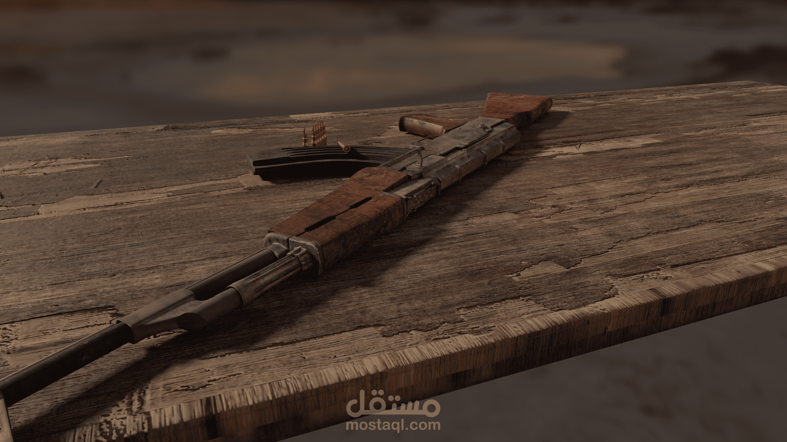 تصميم السلاح ايقوني Ak 47 بشكل قديم و متسخ لتبيان الوقت الذي مرة عليه. مع اعطائة قيمة ذاتية و قيمة نفسية و اعطائة صورة تعبر علي ايقنيته مع وقت