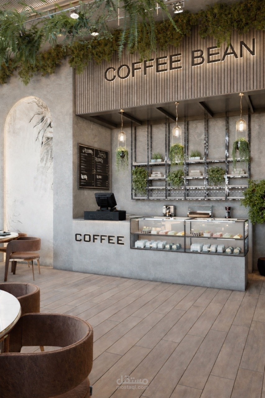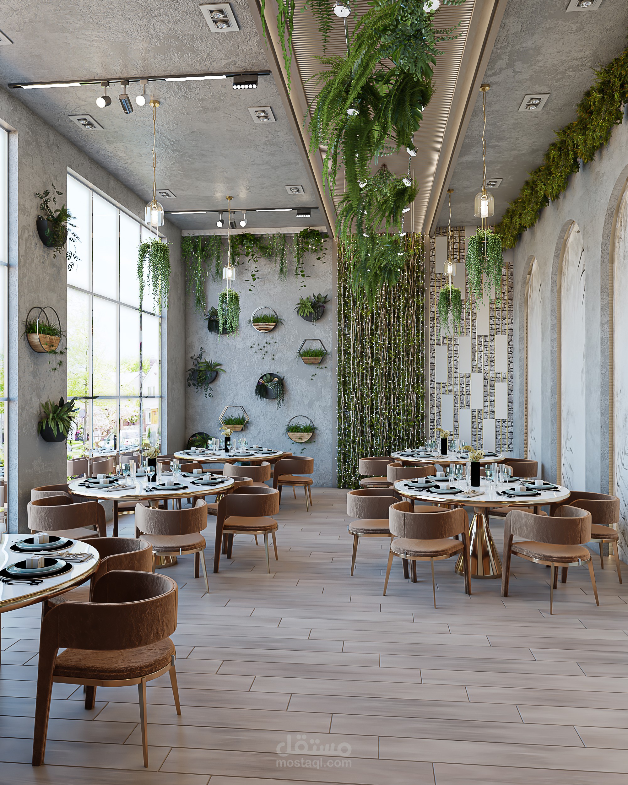 Interior design project for a contemporary restaurant that combines simplicity with elegance. The concept features natural wooden finishes and neutral tones, complemented by hanging and wall greenery to add vibrancy and freshness. Thoughtful lighting and large windows enhance the sense of openness and comfort, resulting in a refined atmosphere that elevates the dining experience.