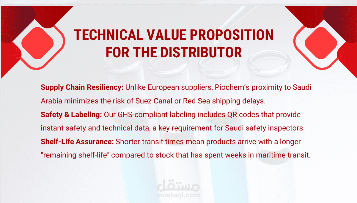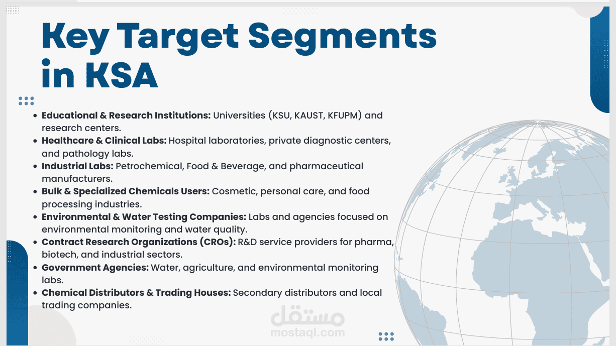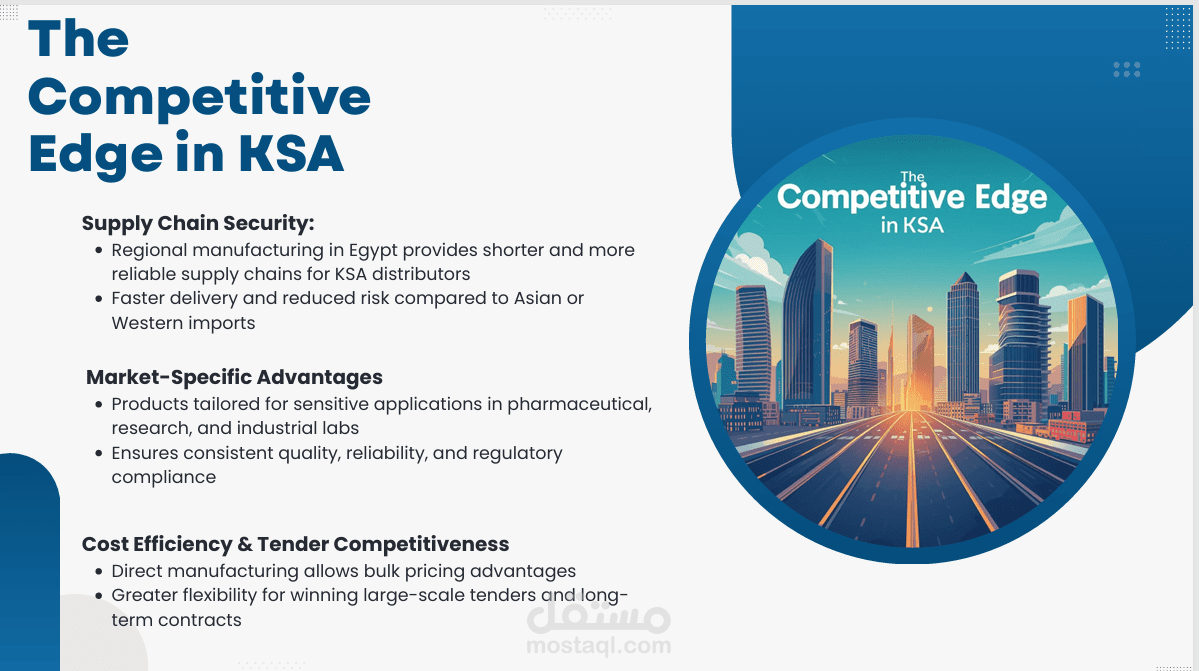 عملت على تطوير عرض مبيعات استراتيجي (Distributor Sales Proposal) يهدف إلى توسّع شركة متخصصة في الكيماويات المعملية والصناعية داخل السوق السعودي من خلال إنشاء شراكة توزيع مع الشركة .