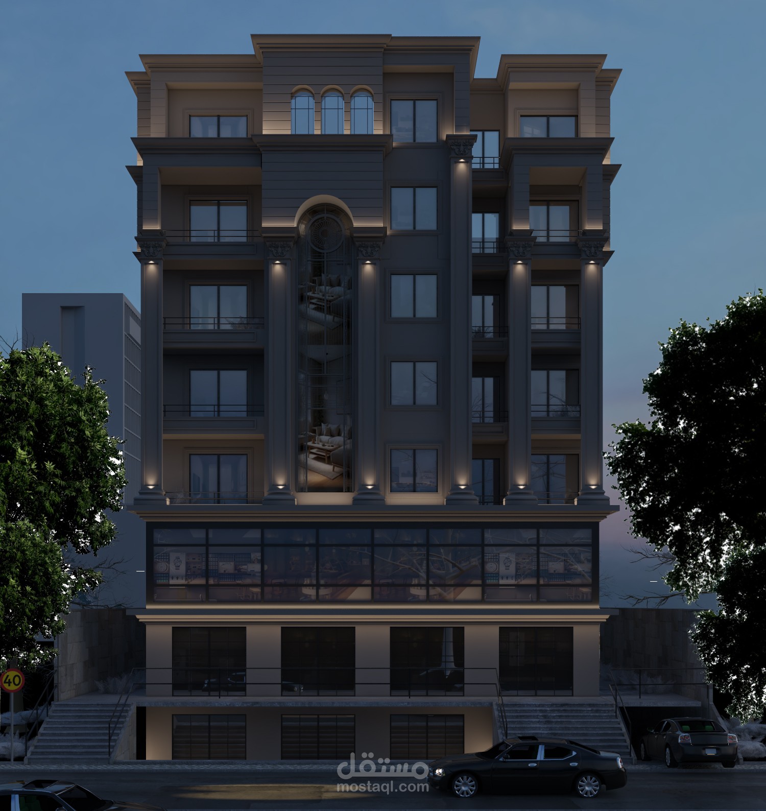Architectural façade design for a mixed-use building that combines residential units on the upper floors with commercial spaces on the ground level. The project features neoclassical-inspired details such as symmetrical columns and decorative cornices, complemented by large glass storefronts. The design achieves a balance between elegance and functionality, creating a distinguished urban presence that serves both residents and visitors.