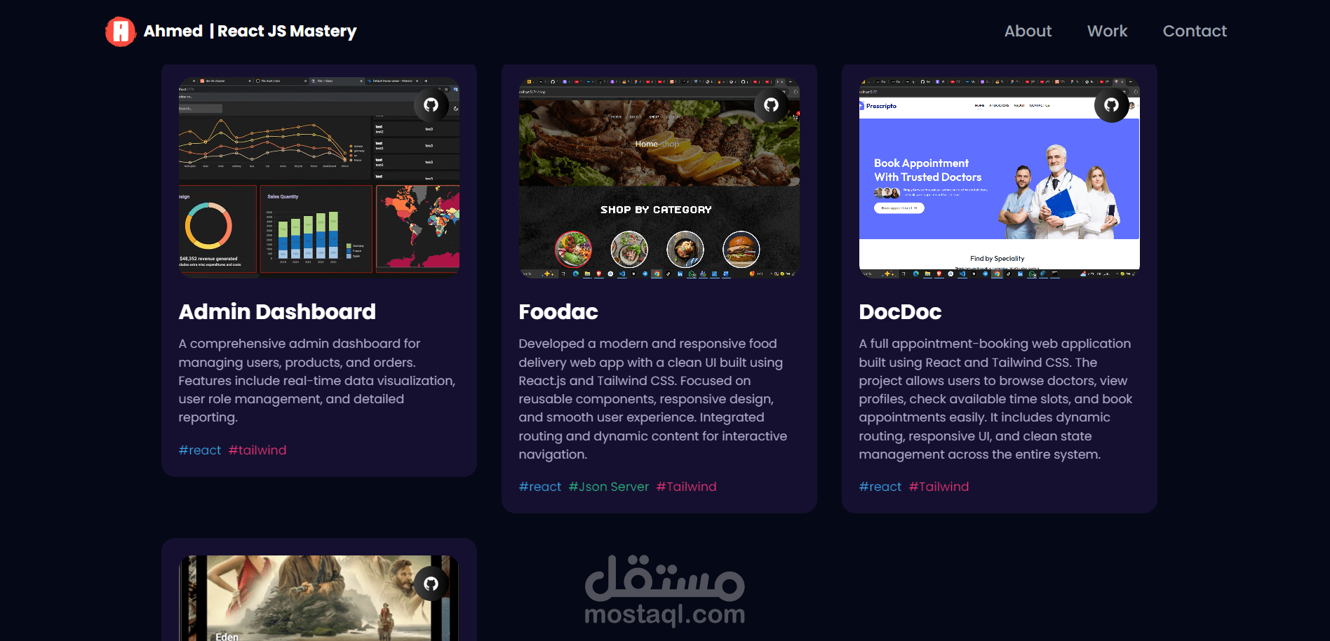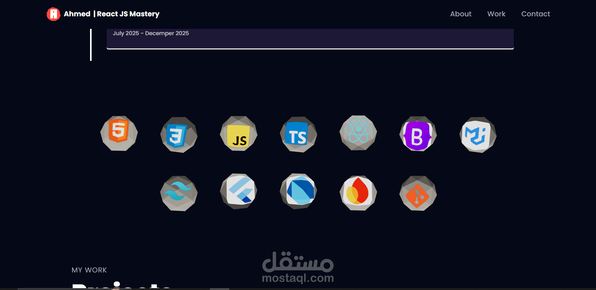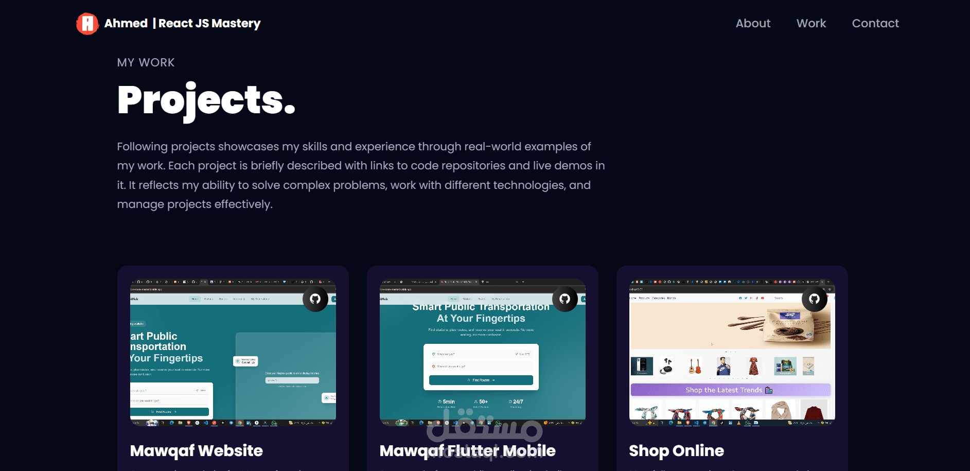 كما يشمل قسم مخصص لعرض المشاريع بشكل تفصيلي مع توضيح فكرة كل مشروع والتقنيات المستخدمة فيه، بالإضافة إلى تأثيرات حركية بسيطة تساعد على جذب الانتباه دون التأثير على الأداء.