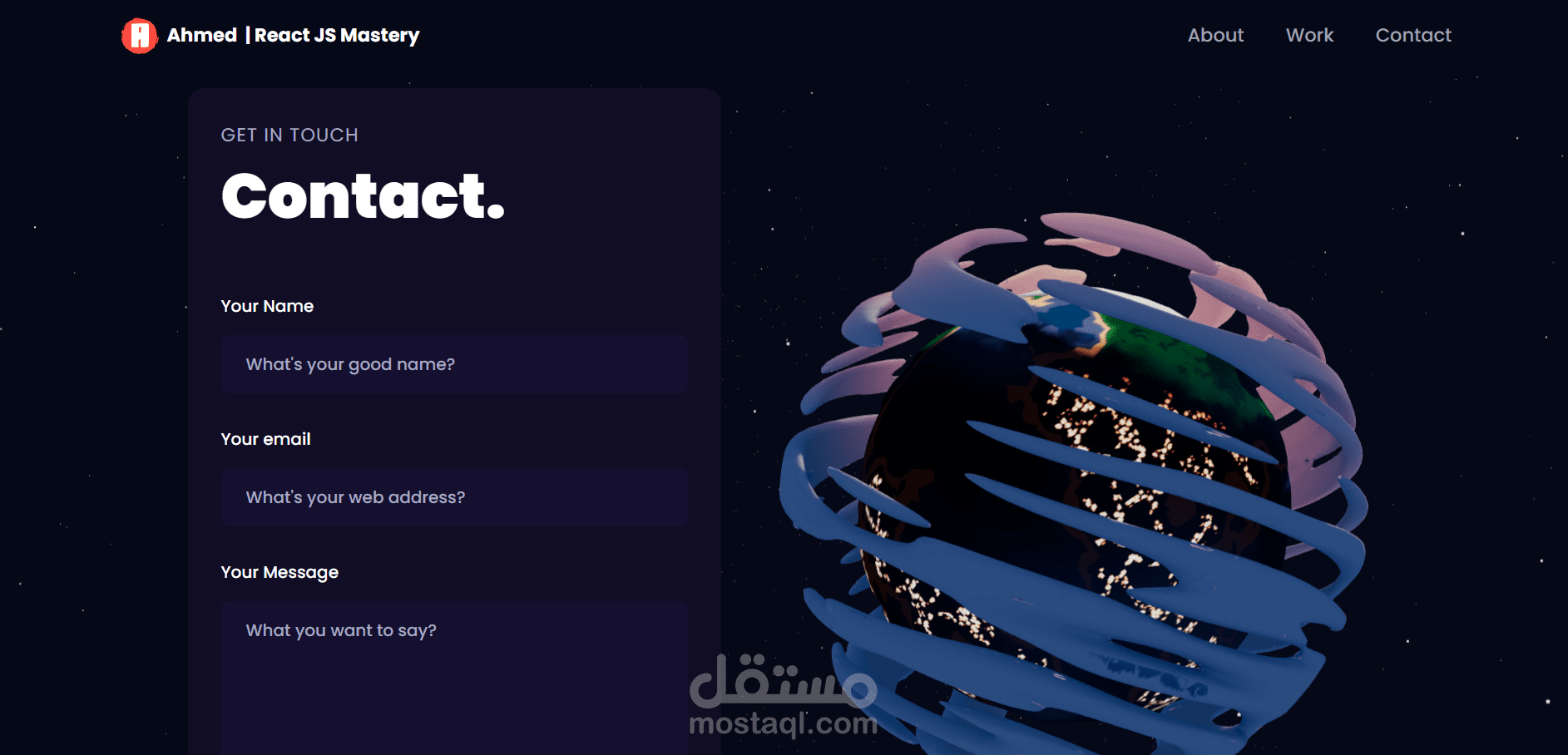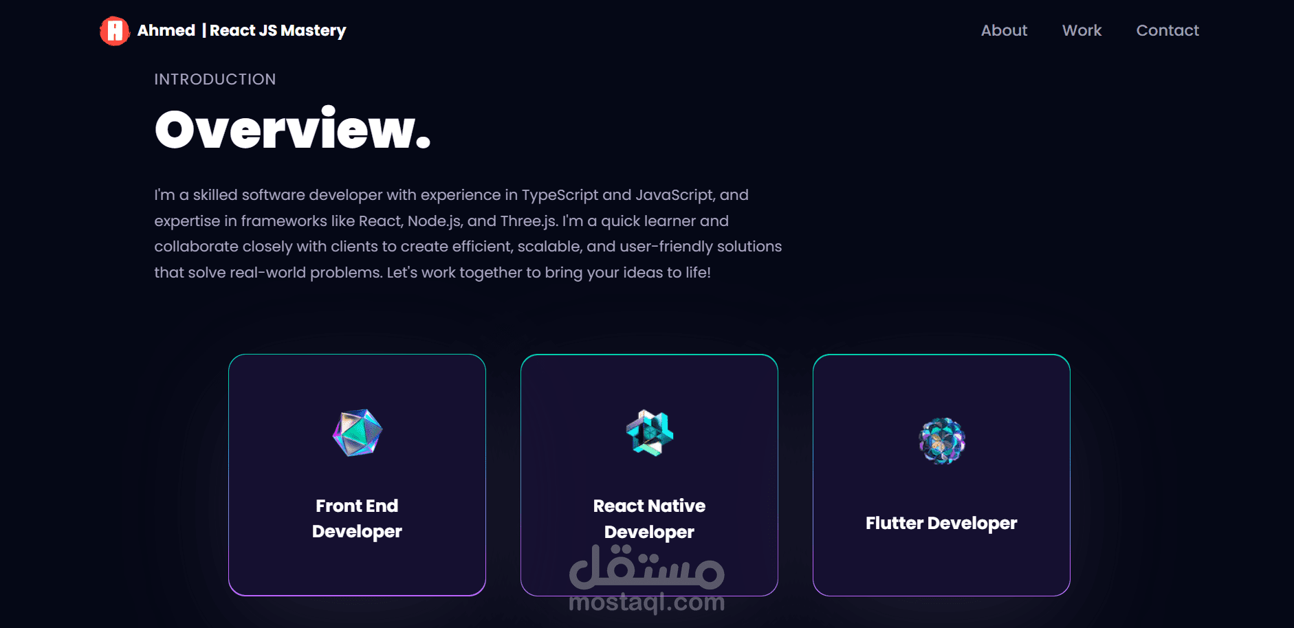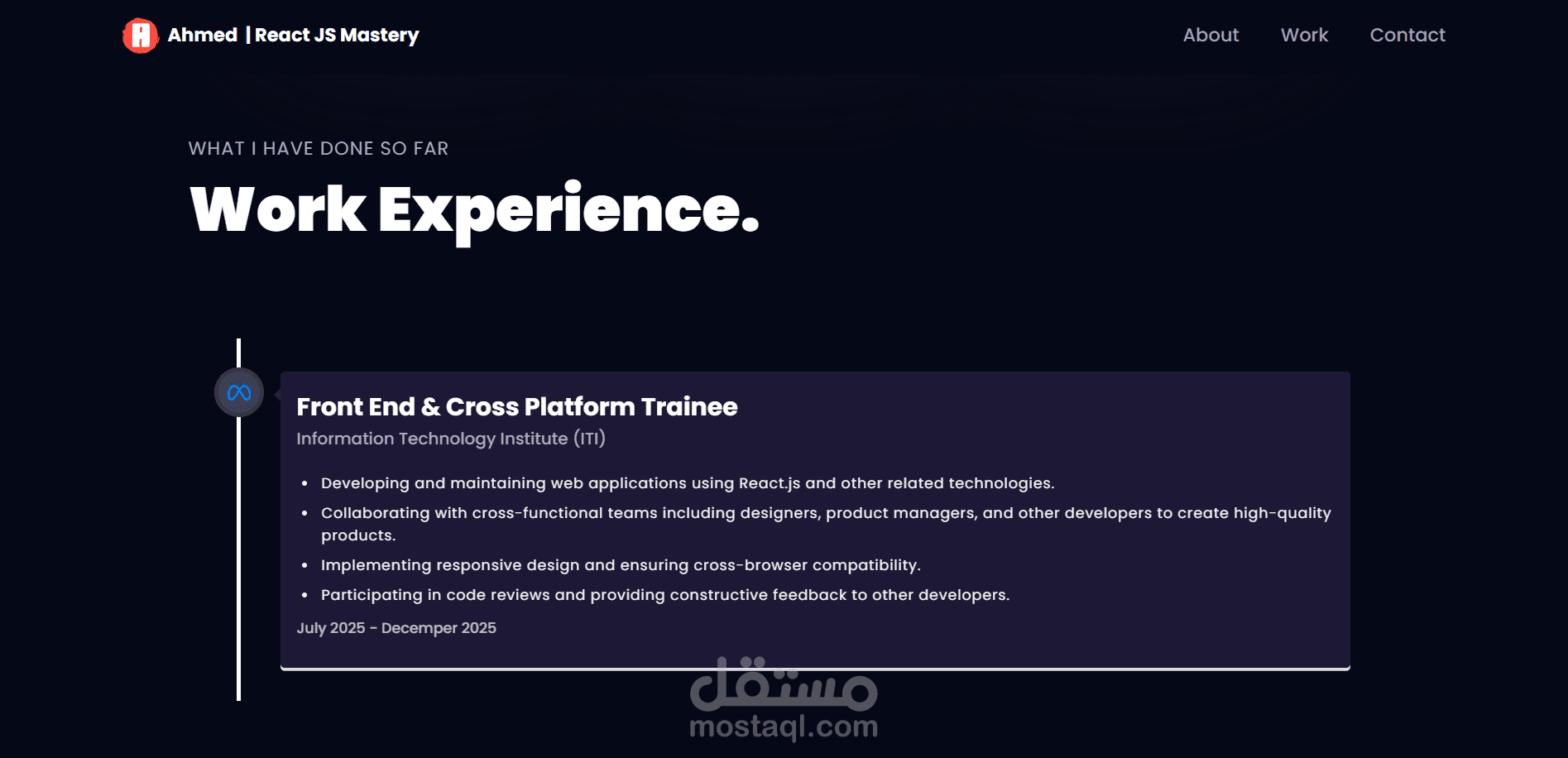 كما يشمل قسم مخصص لعرض المشاريع بشكل تفصيلي مع توضيح فكرة كل مشروع والتقنيات المستخدمة فيه، بالإضافة إلى تأثيرات حركية بسيطة تساعد على جذب الانتباه دون التأثير على الأداء.