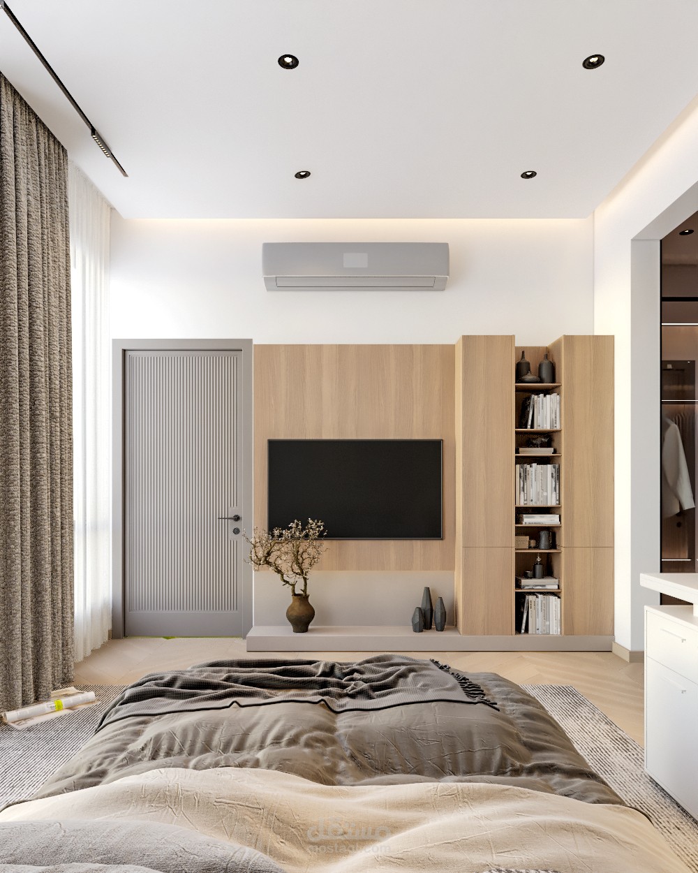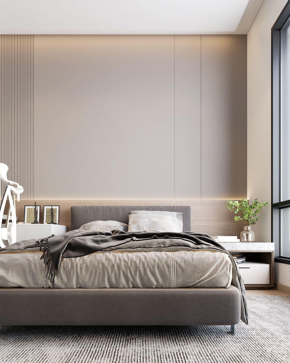 Neutral colors and natural materials help create a calm atmosphere, while decorative accents add a subtle sense of luxury. The design aims to provide a comfortable personal retreat that reflects modern lifestyle and refined taste.