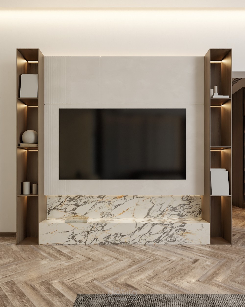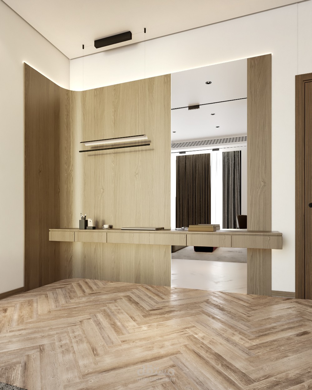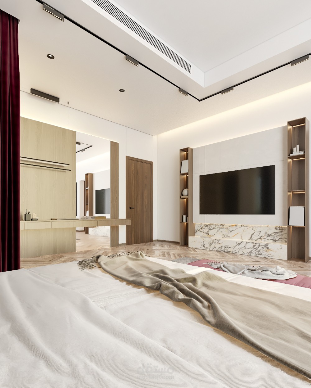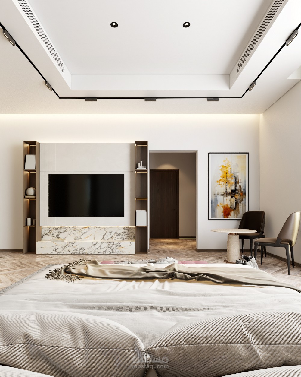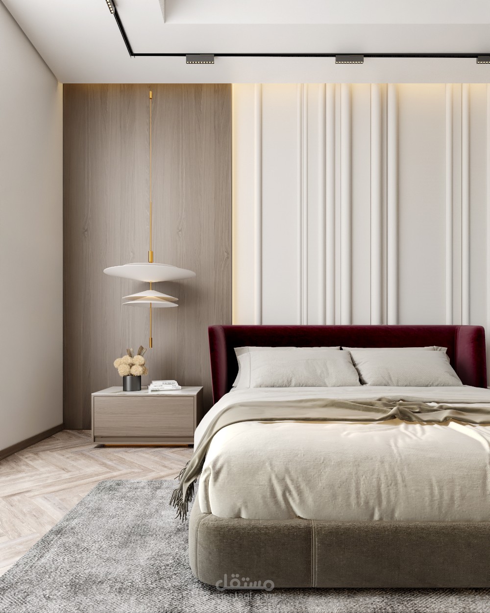 This modern bedroom is designed to create a calm and relaxing atmosphere through a balanced composition of clean lines, soft textures, and neutral tones. The design focuses on simplicity and functionality while maintaining an elegant aesthetic.