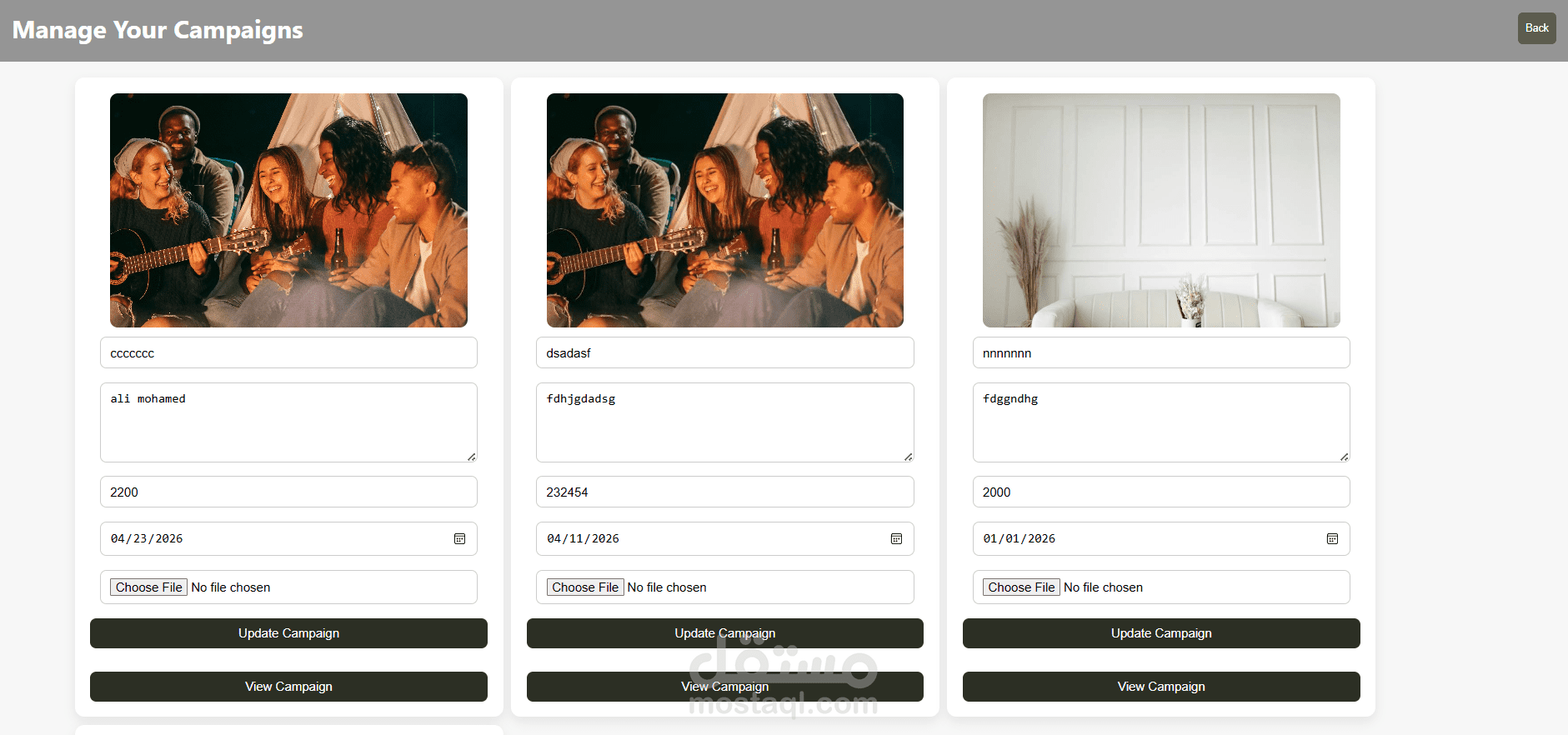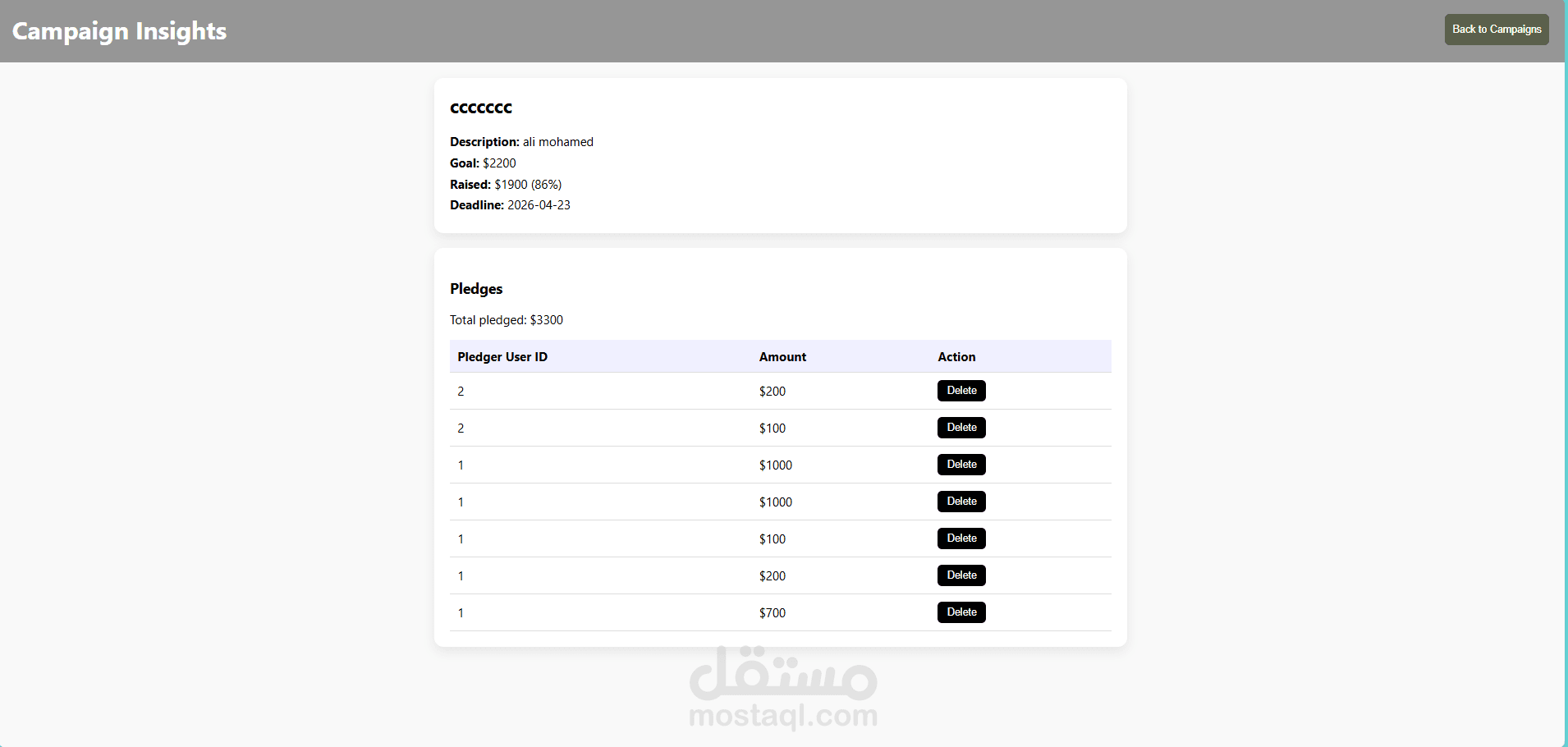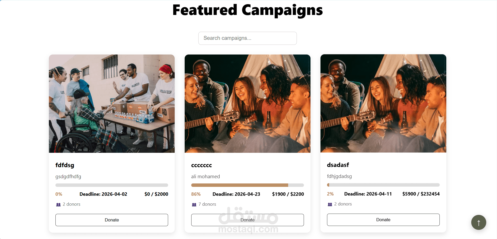 مشروع عبارة عن منصة تمويل جماعي (Crowdfunding Platform) تتيح للمستخدمين إنشاء حملات لجمع التمويل ودعم حملات الآخرين بطريقة سهلة وتفاعلية، مستوحاة من منصات مثل GoFundMe وKickstarter.