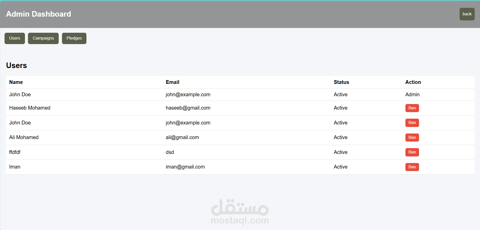 Admin: إدارة المستخدمين والحملات (قبول / رفض / حذف)