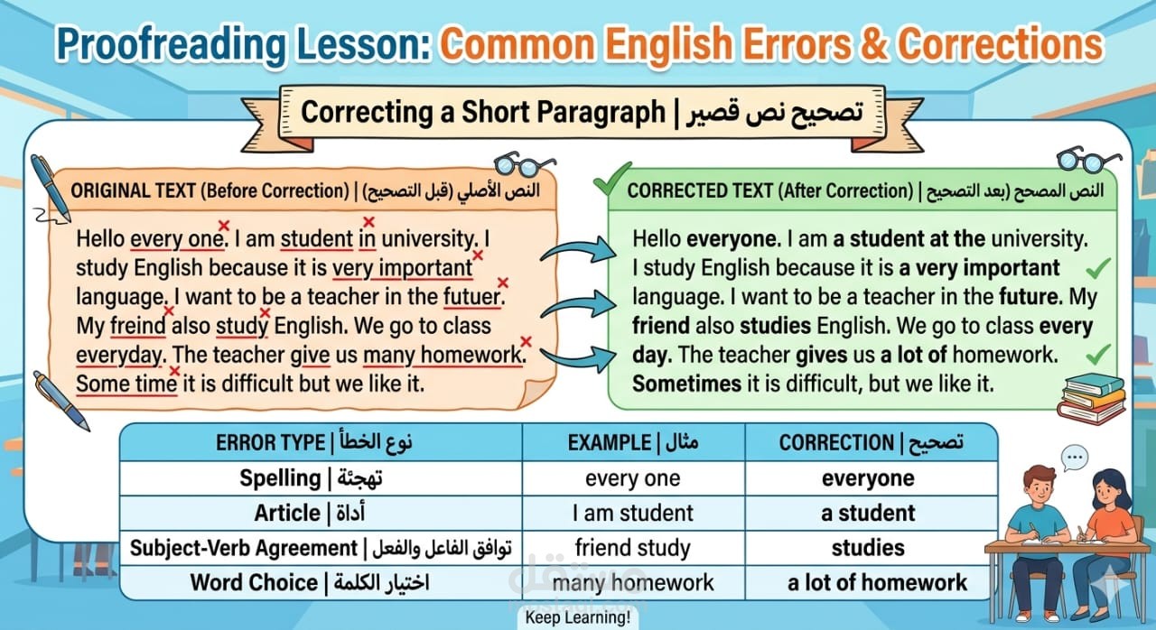 نموذج تدقيق لغوي (Proofreading) يوضح قدرتي على تصحيح الأخطاء الإملائية والنحوية في النصوص الإنجليزية. يحتوي النموذج على النص قبل التصحيح، النص بعد التصحيح، وجدول يوضح أنواع الأخطاء وكيفية تصحيحها. مناسب للطلاب والكتاب الذين يرغبون في تحسين نصوصهم الإنجليزية.