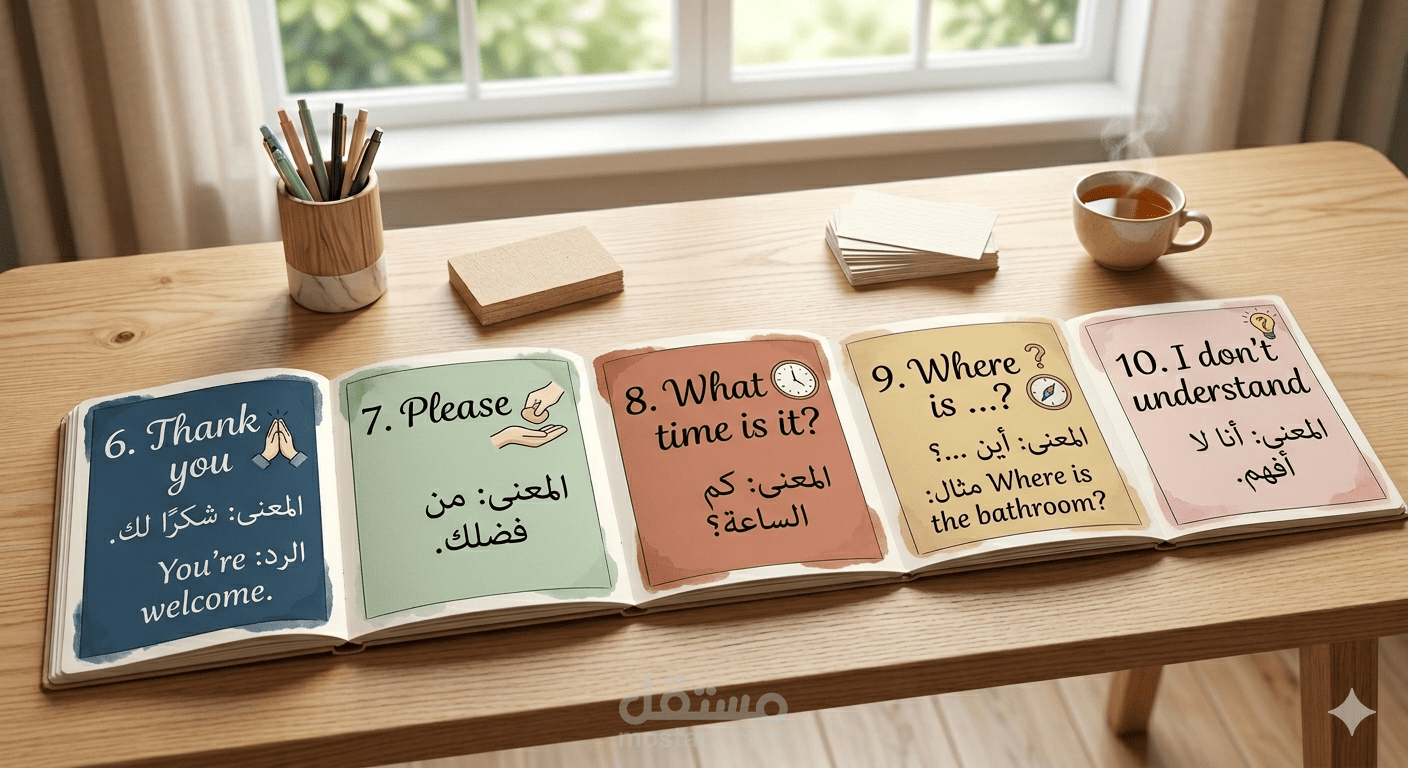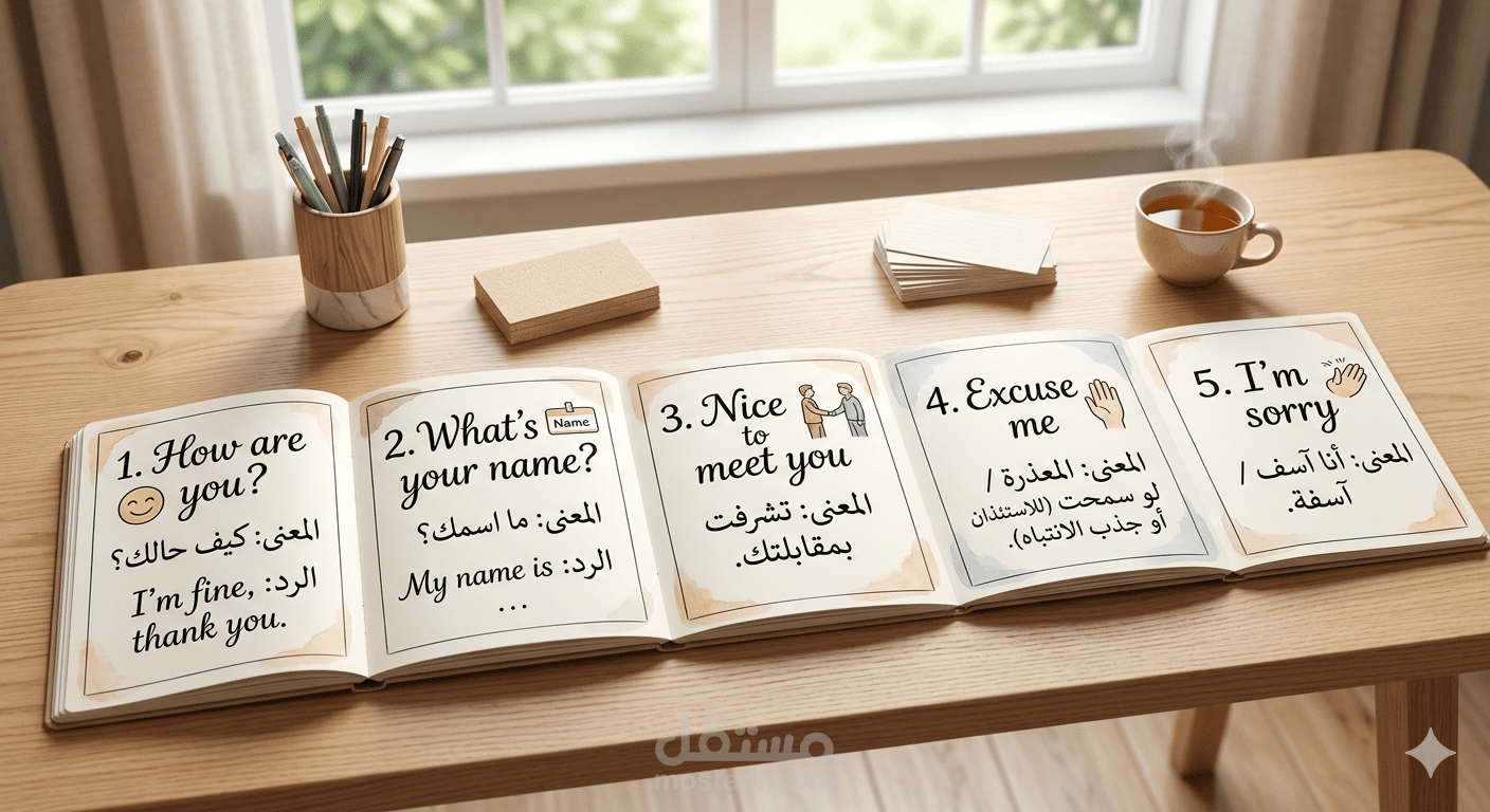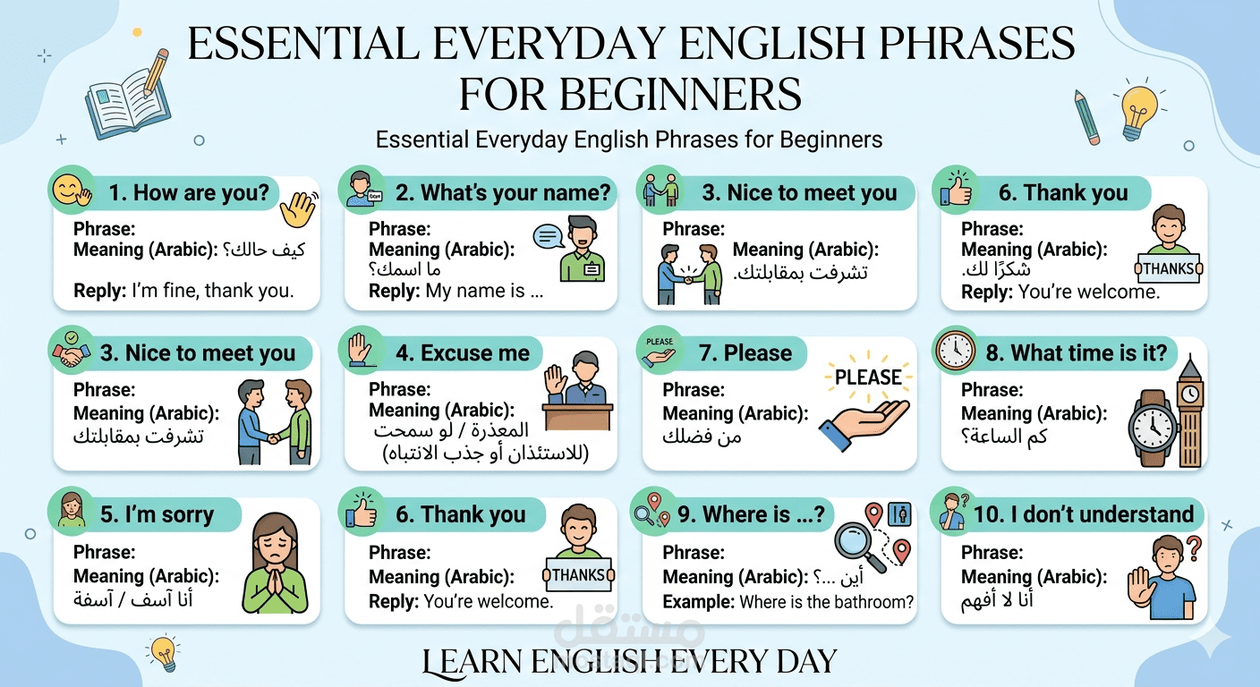 مقال تعليمي مبسط للمبتدئين في اللغة الإنجليزية، يشرح 10 عبارات يومية أساسية مع الترجمة إلى العربية. تم إعداد المقال بأسلوب احترافي ومنظم، مناسب للطلاب العرب الذين يرغبون في تعلم المحادثات اليومية بسهولة.