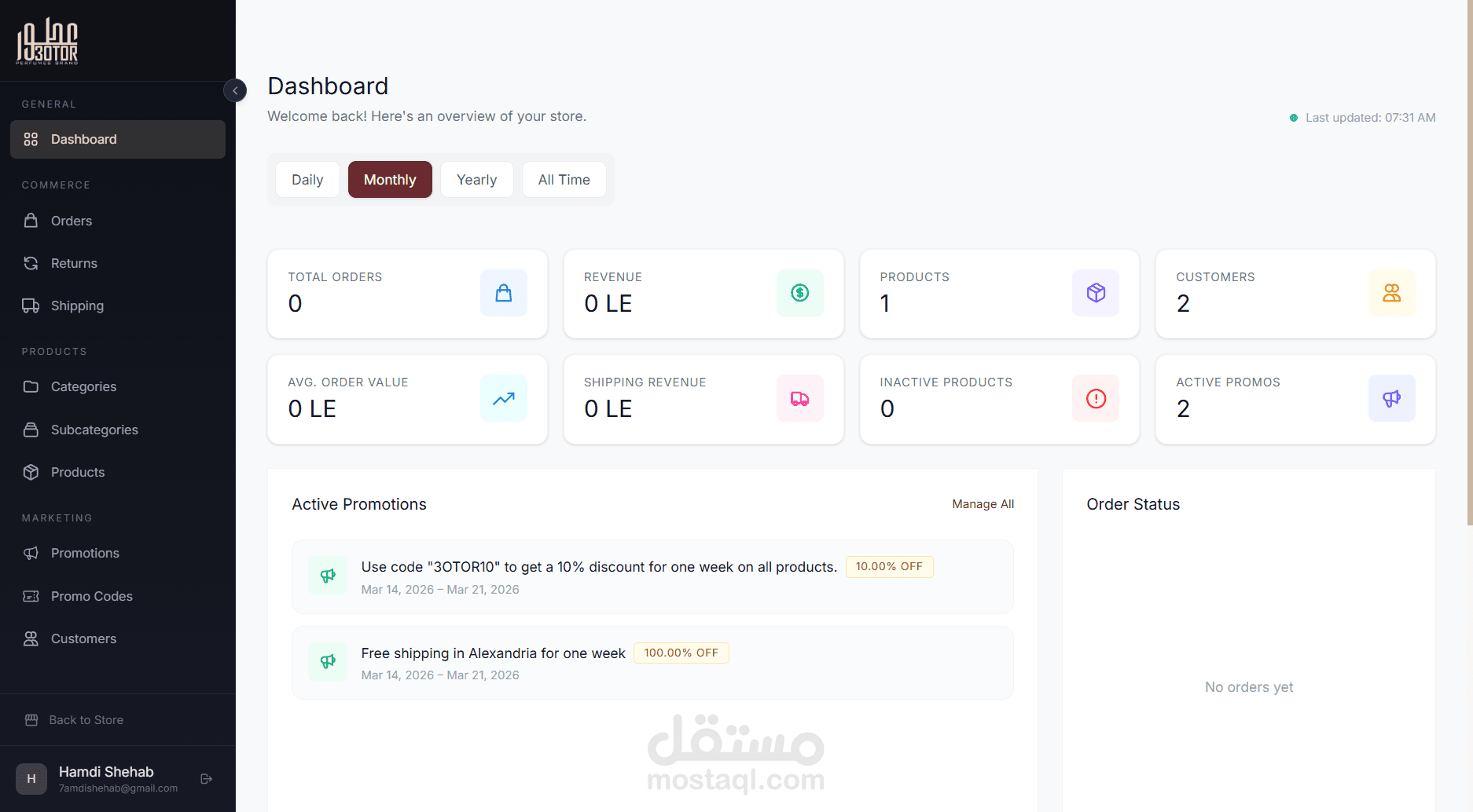 تتيح لوحة تحكم إدارية متطورة إدارة المنتجات، والعروض الترويجية، والتحكم في الشحن، وتحليل البيانات.