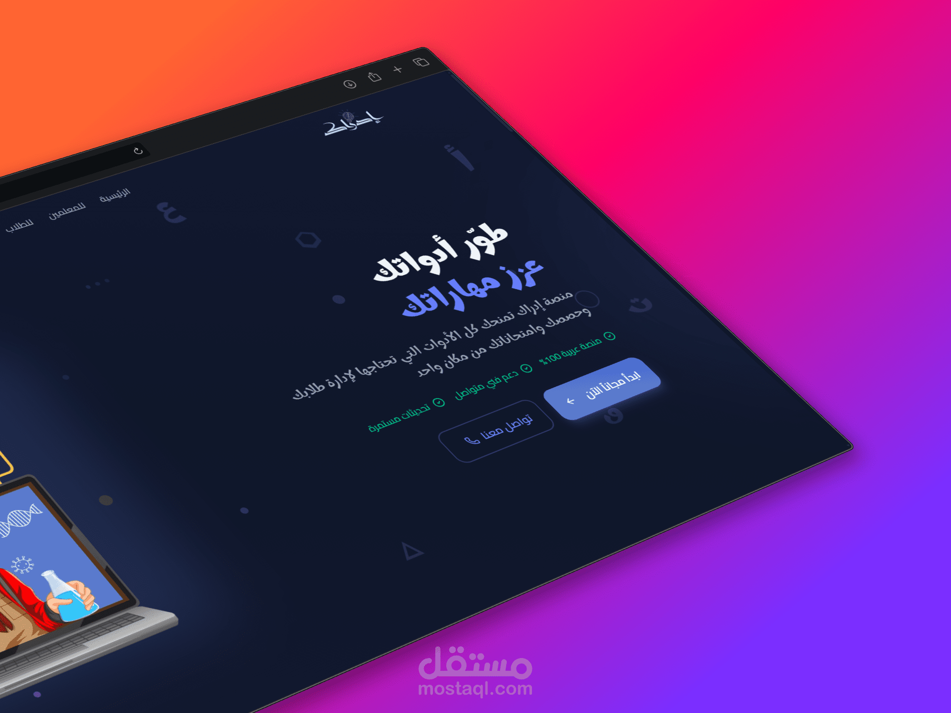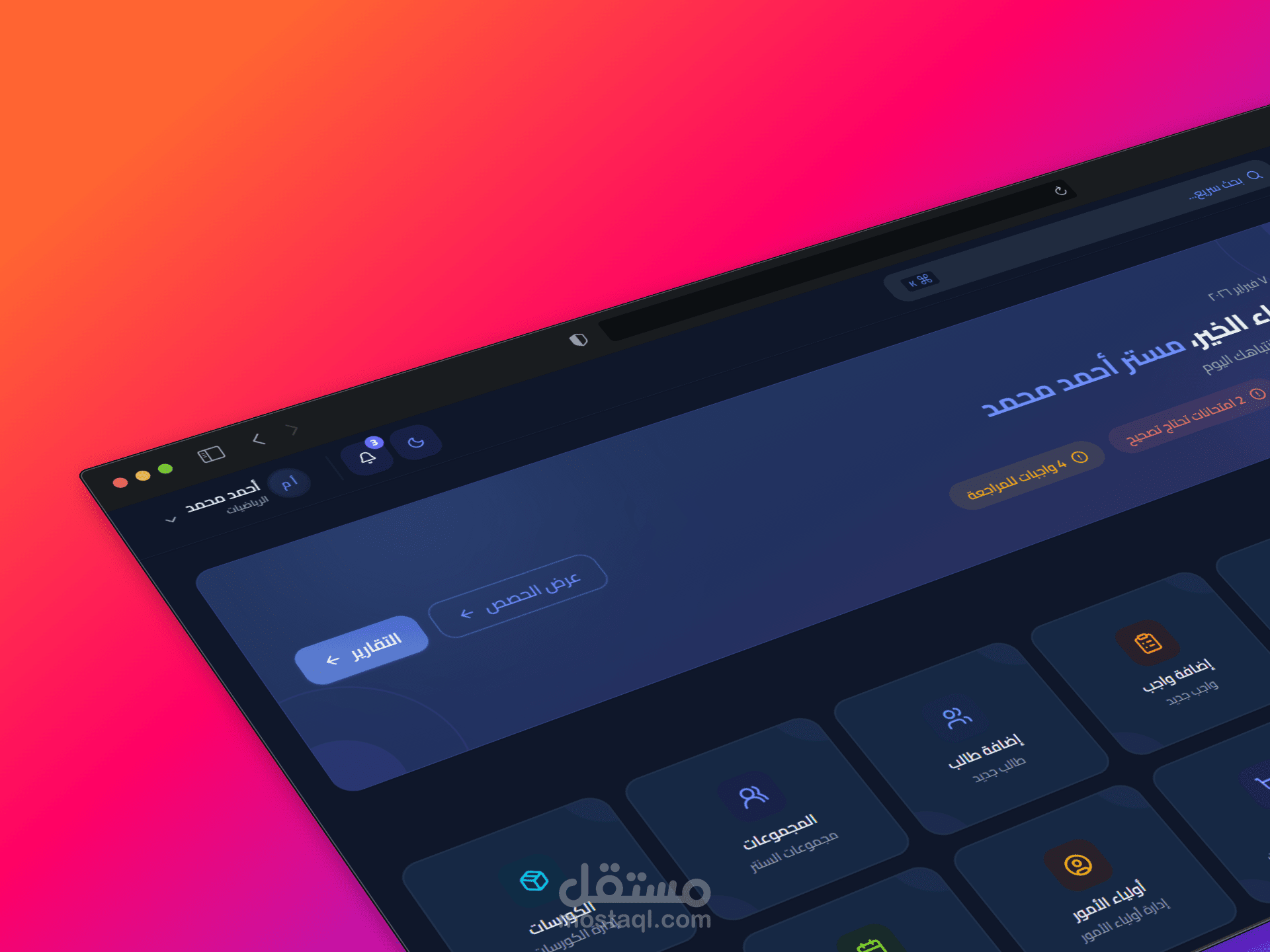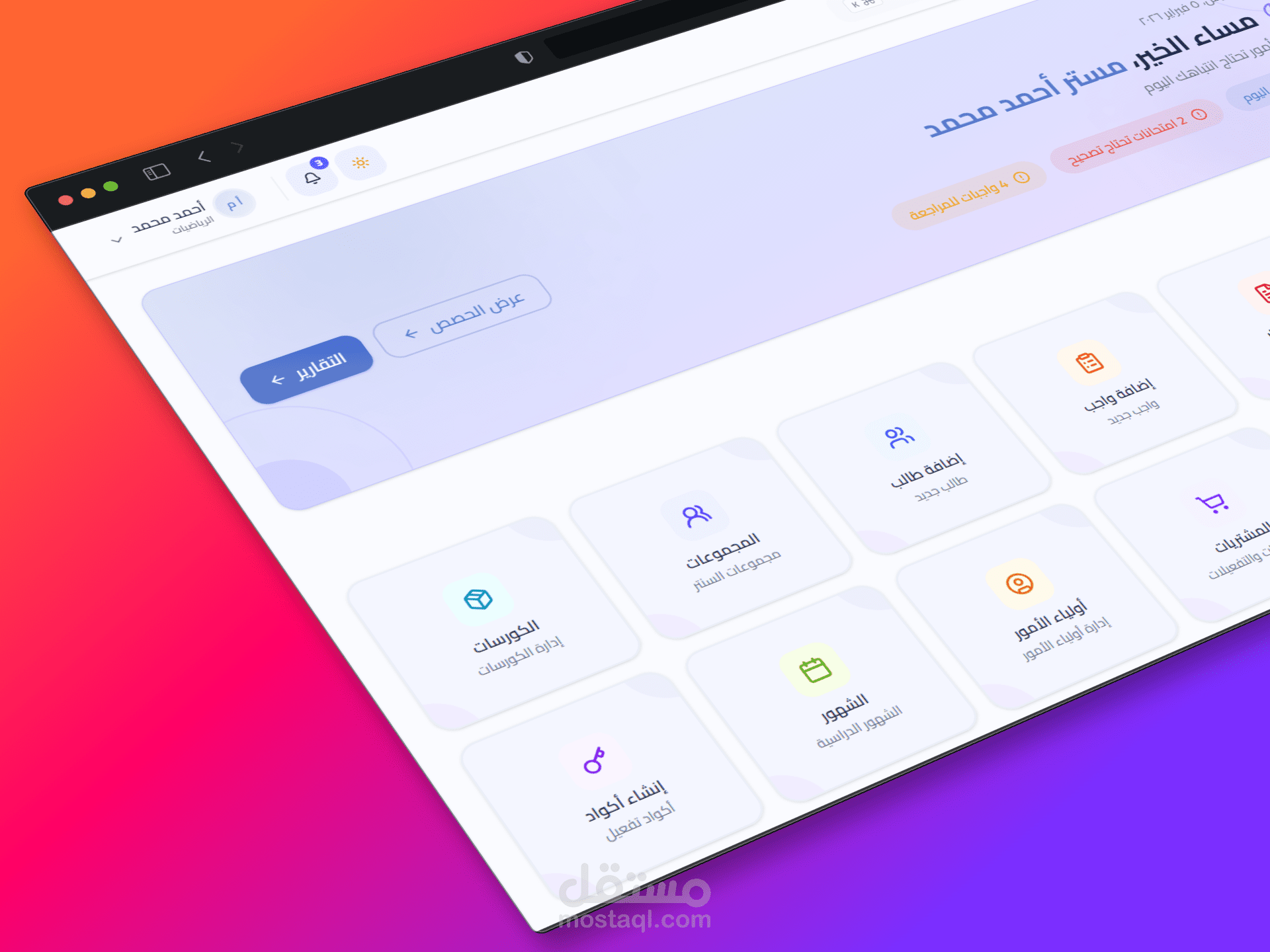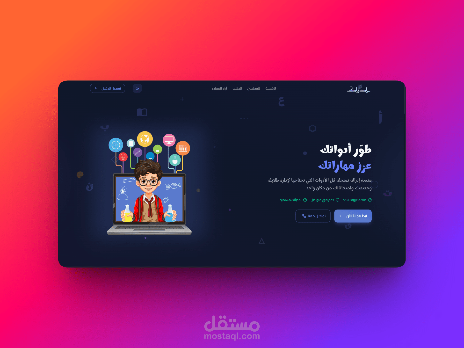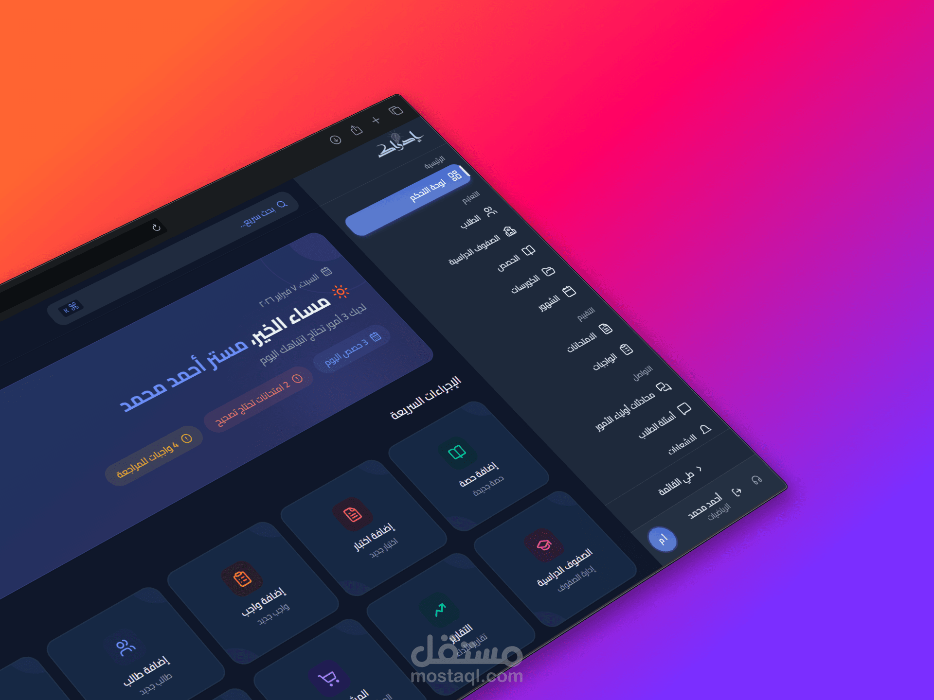 إدراك نظام متكامل لإدارة شؤون المعلمين والطلاب، يمكّن المؤسسات التعليمية من إدارة عملياتها التعليمية بكفاءة. تشمل المنصة تتبع الحضور، ومراقبة الأداء الأكاديمي، ونظام التقييم، والتواصل بين المعلمين وأولياء الأمور، وتقارير مفصلة عن تقدم الطلاب. تم تطويرها باستخدام أحدث التقنيات، وتتميز بواجهة عصرية سهلة الاستخدام.
