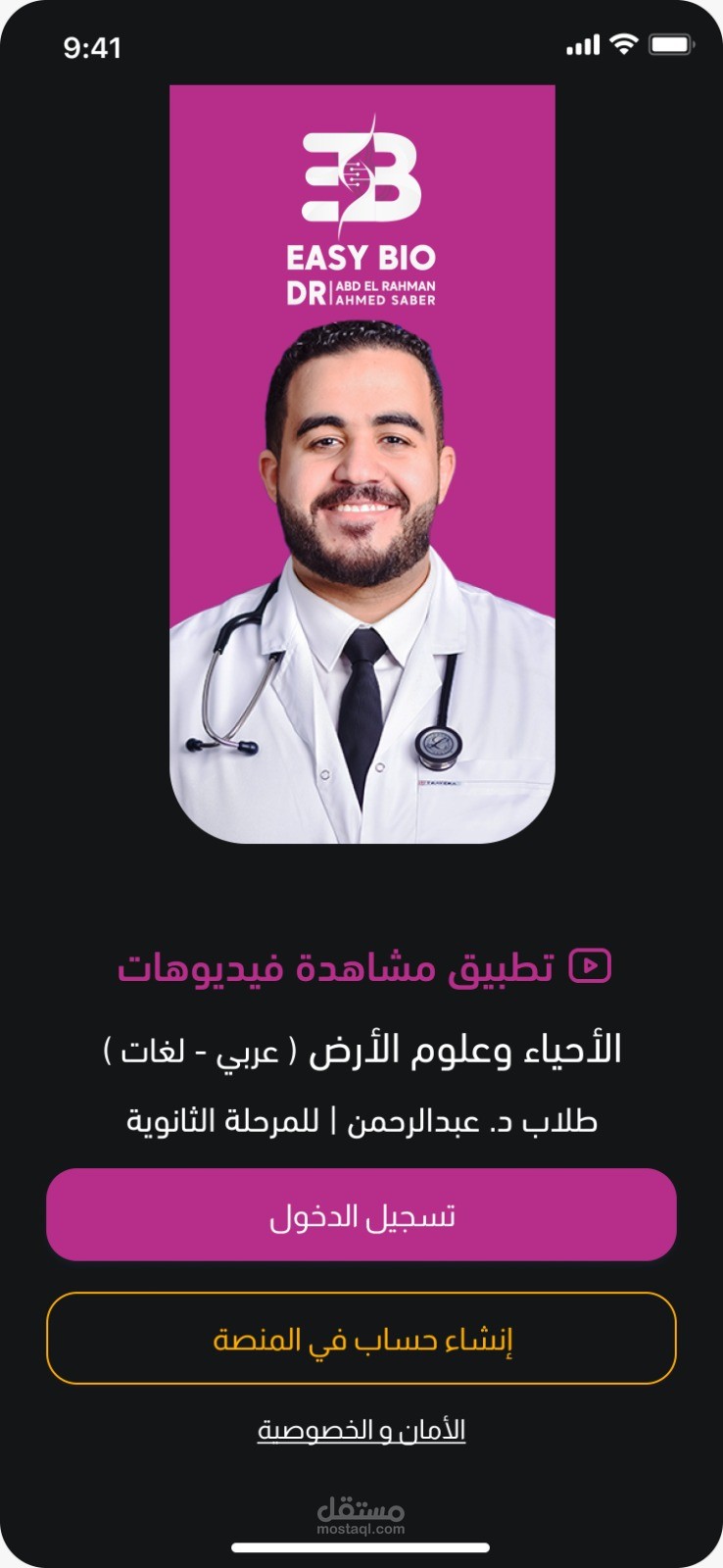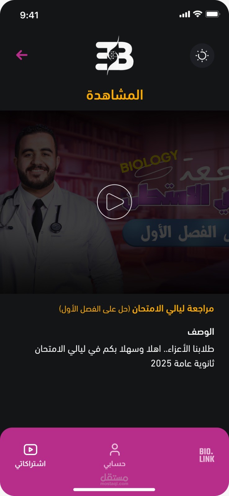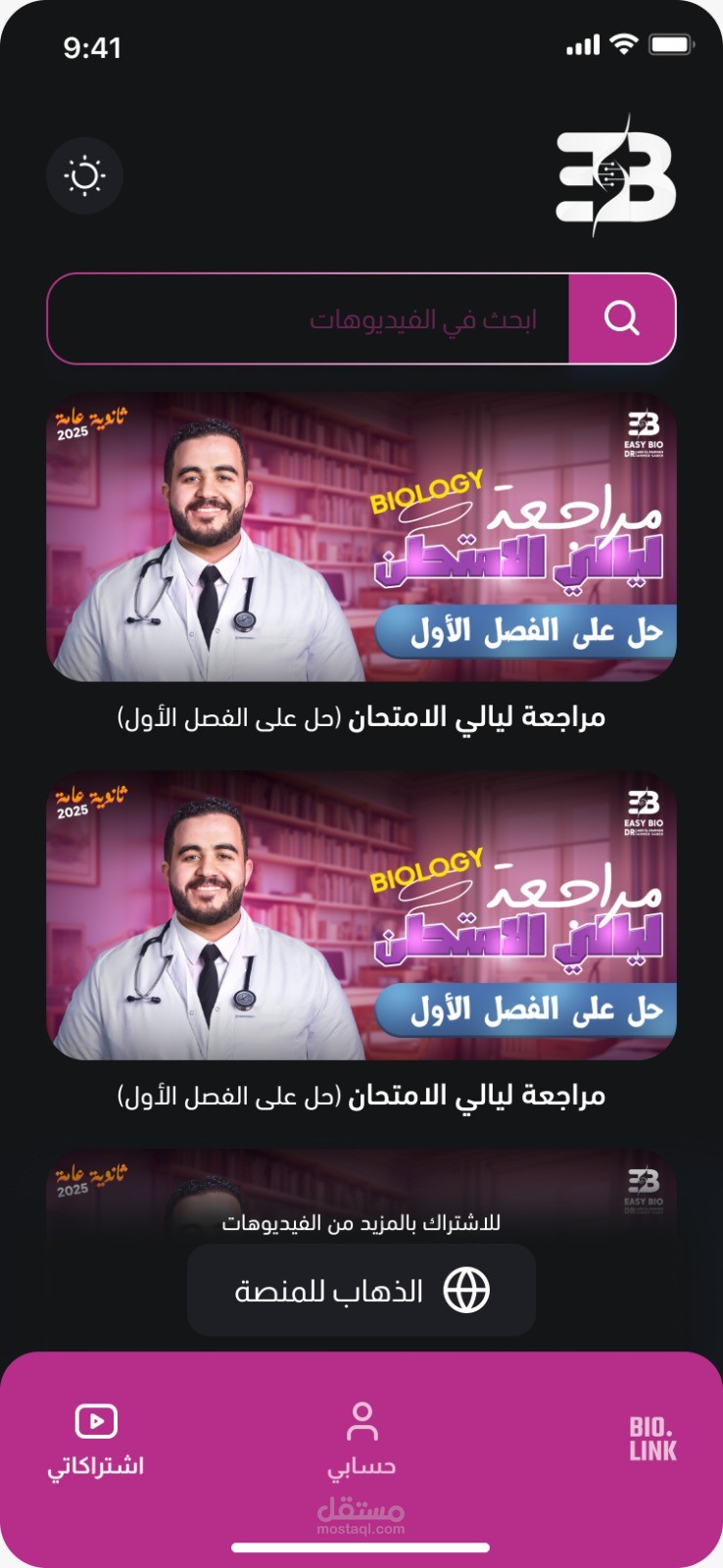 منصة تعليمية لبث الفيديوهات لطلاب الأحياء. تشمل الميزات دروس فيديو مع إمكانية الوصول إلى محتوى مدفوع/مجاني، وملفات تعريف المستخدمين، ودعم الوضع الداكن، وتجربة مشاهدة سلسة. يوفر التطبيق واجهة سهلة الاستخدام للطلاب للوصول إلى المحتوى التعليمي وتتبع تقدمهم الدراسي.