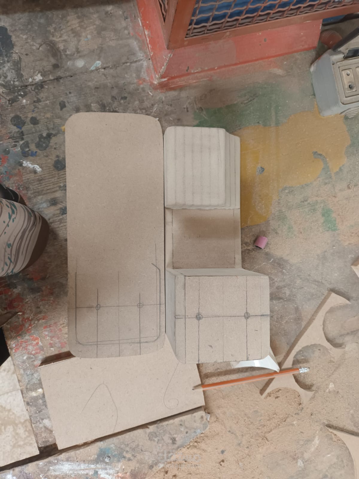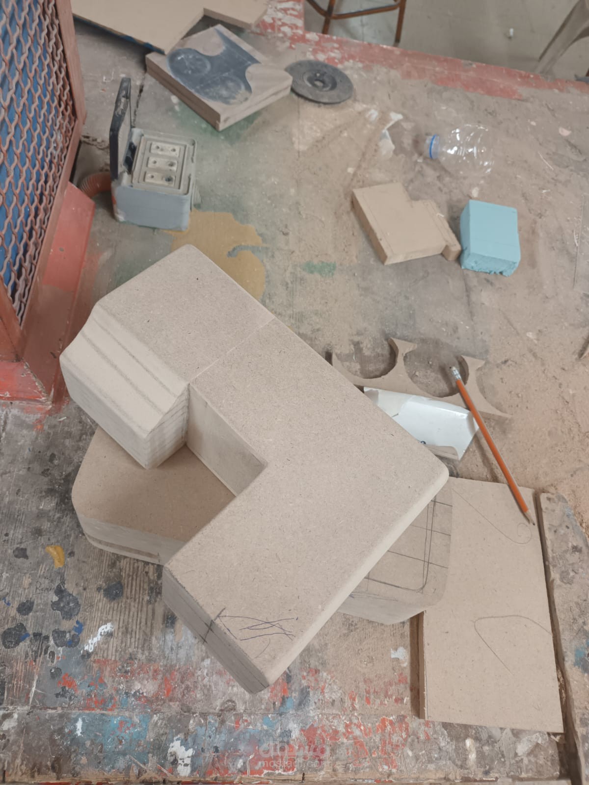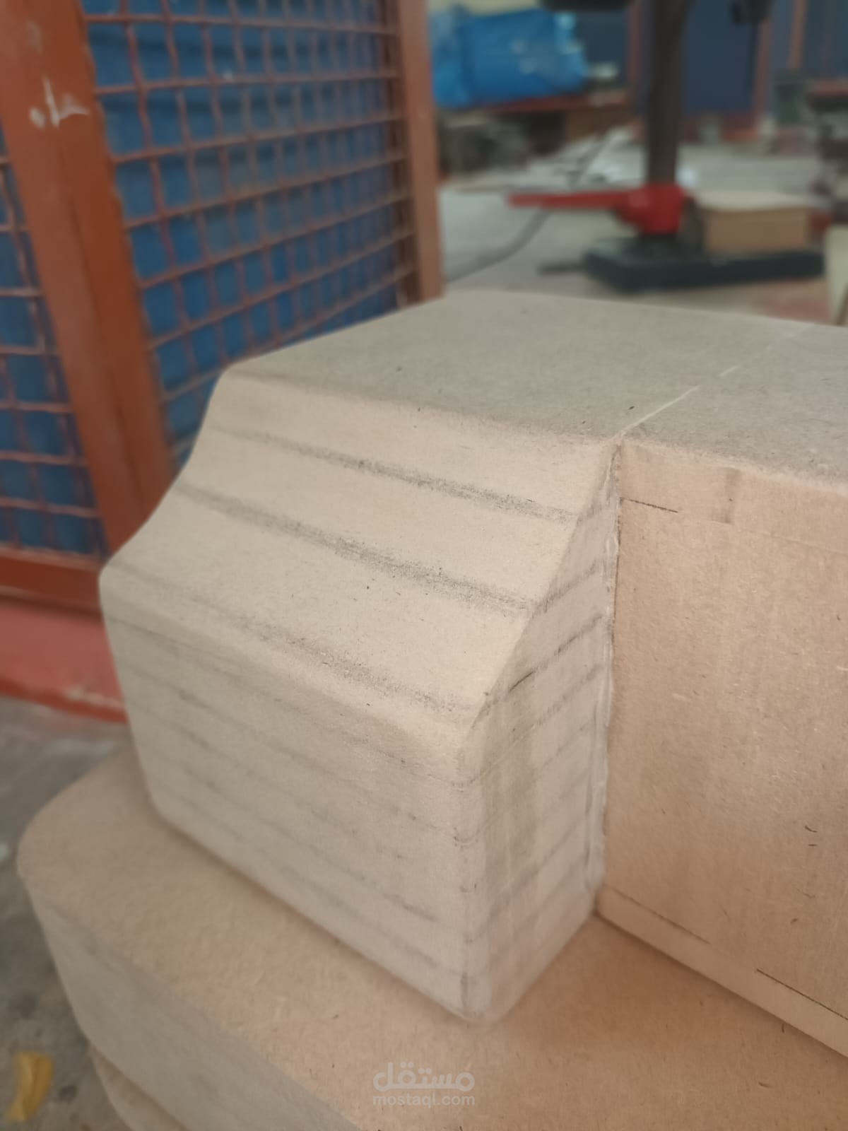 تم تصنيع النموذج باستخدام خامة الخشب MDF لسهولة التشكيل وإظهار أبعاد المنتج بشكل واضح، مما يساعد على اختبار التصميم وتقييمه من الناحية البصرية والوظيفية.