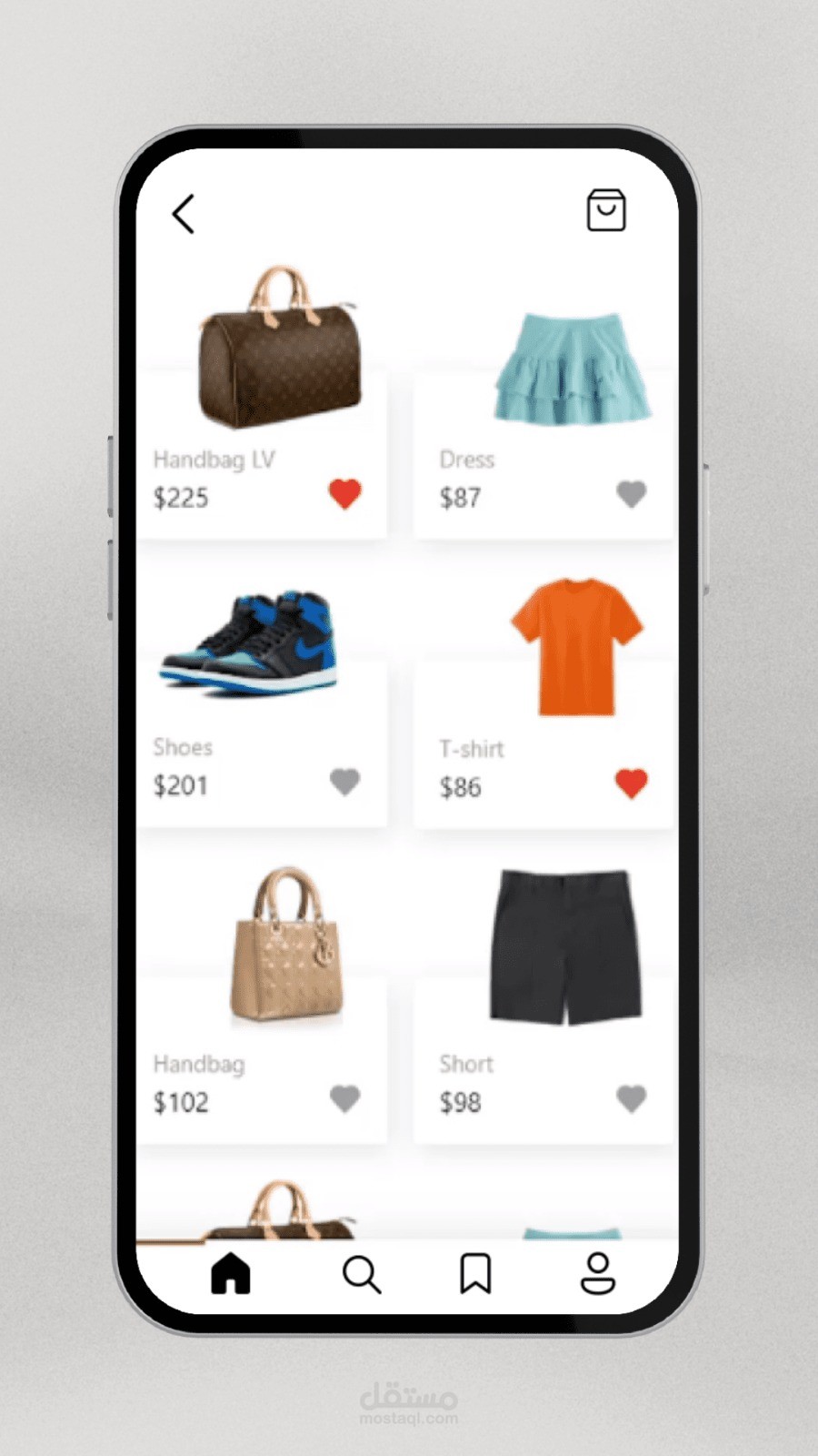 * Home Screen: عرض المنتجات بشكل شبكي (GridView) مع ميزة إضافة للمفضلة.