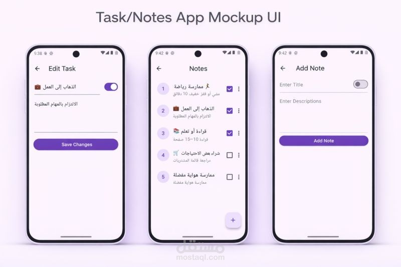 * التحقق من البيانات (Form Validation): تضمين منطق التحقق في شاشات "إضافة ملاحظة" و"تعديل المهمة" لضمان إدخال بيانات صحيحة.