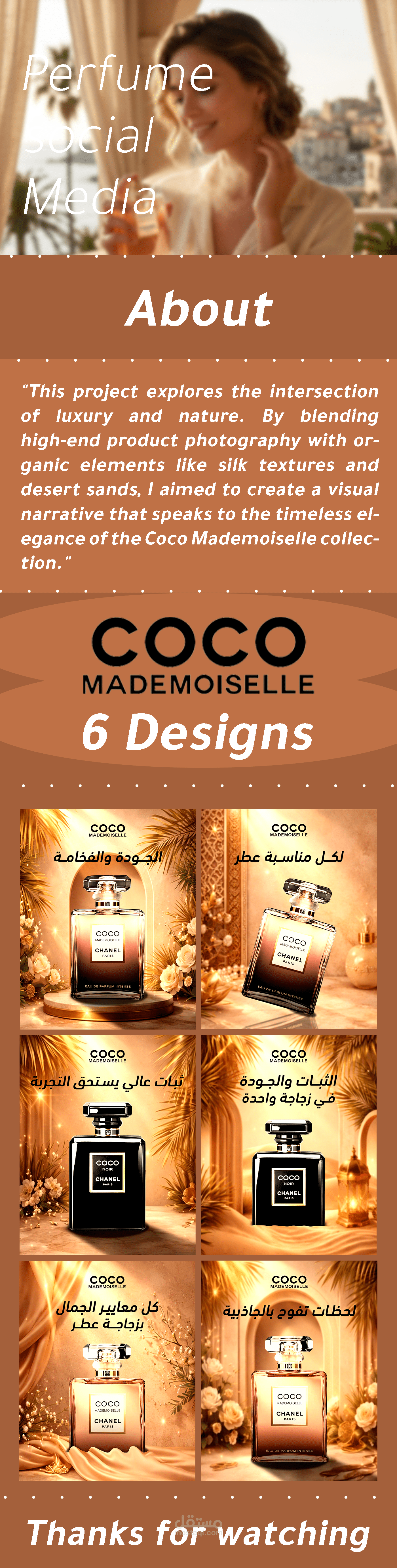 Chanel Coco Mademoiselle - Social Media Campaign (Conceptual) A luxury social media design project for Chanel Paris, focusing on the timeless elegance of the Coco Mademoiselle collection. Concept: The project explores the intersection of high-end fashion and natural elements. By blending warm golden lighting with textures like silk, sand, and floral accents, I aimed to create a visual narrative that reflects sophistication and sensory appeal. Key Focus: Lighting & Shadows: Detailed work on glass reflections and realistic shadow depth to enhance the luxury feel. Color Grading: A cohesive warm palette to evoke feelings of warmth and exclusivity. Composition: Strategic placement of elements to ensure the product remains the hero. Tools: Adobe Photoshop Role: Graphic Design Trainee