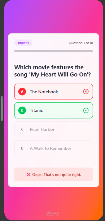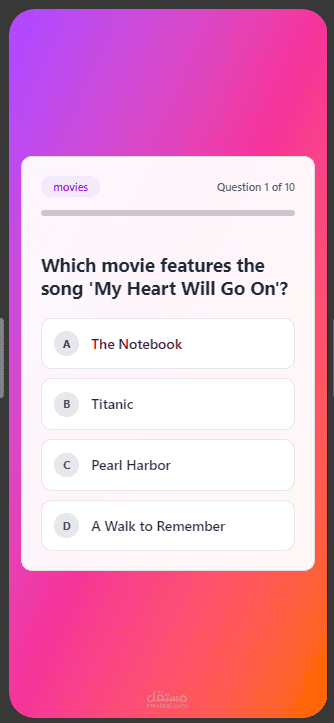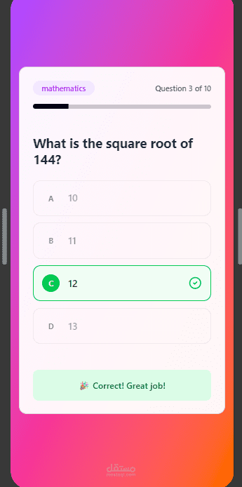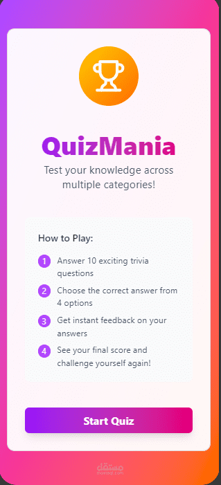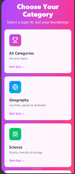 تطبيق موبايل تفاعلي مبني باستخدام تقنية Flutter، يهدف إلى تقديم تجربة مستخدم سلسة وجذابة لاختبار المعلومات في مجالات متعددة. تم التركيز في هذا المشروع على بناء واجهة مستخدم حديثة (Modern UI)، مع كتابة كود نظيف ومنظم يضمن سهولة الصيانة وقابلية التوسع (Scalable Architecture).