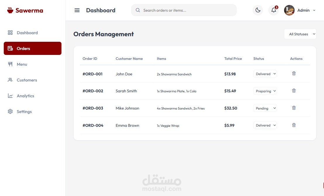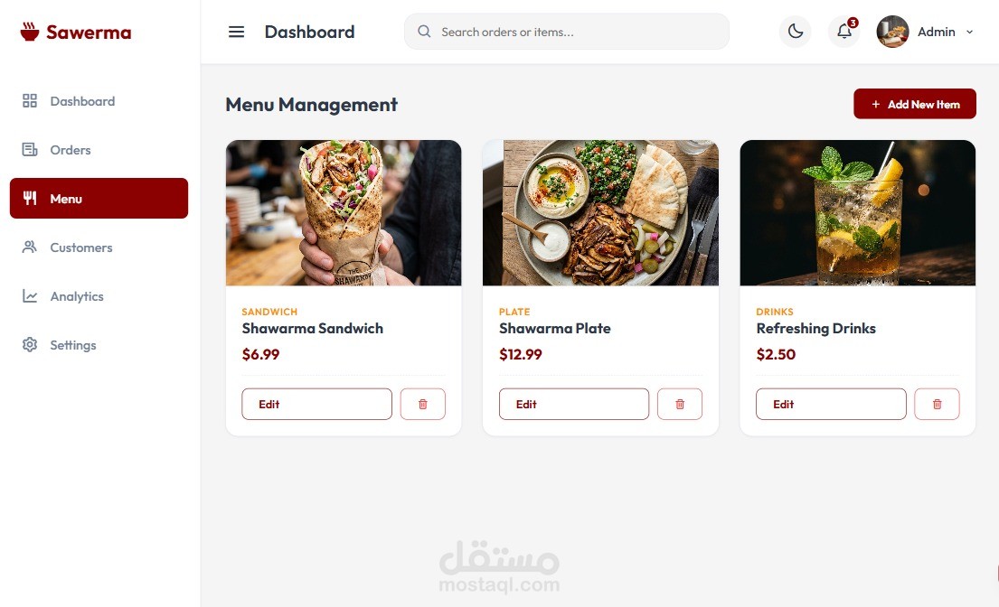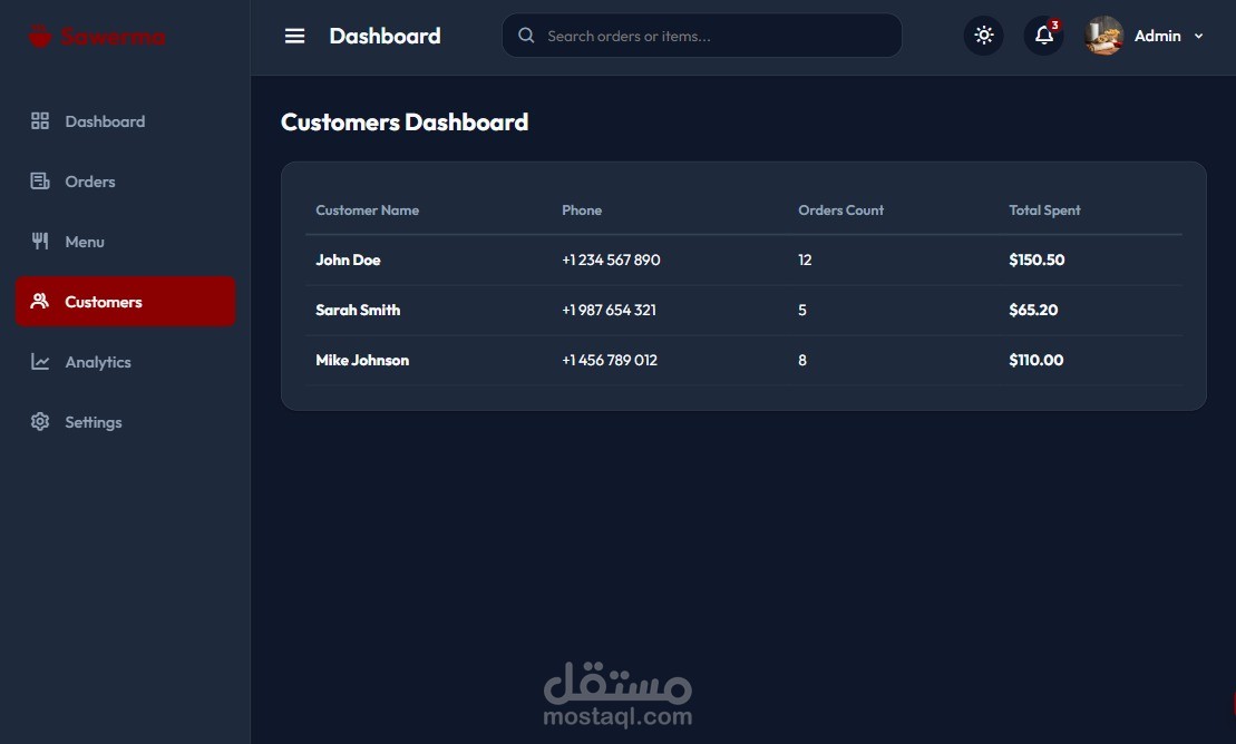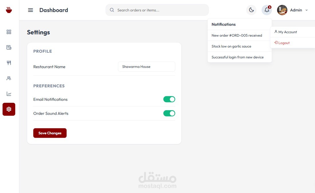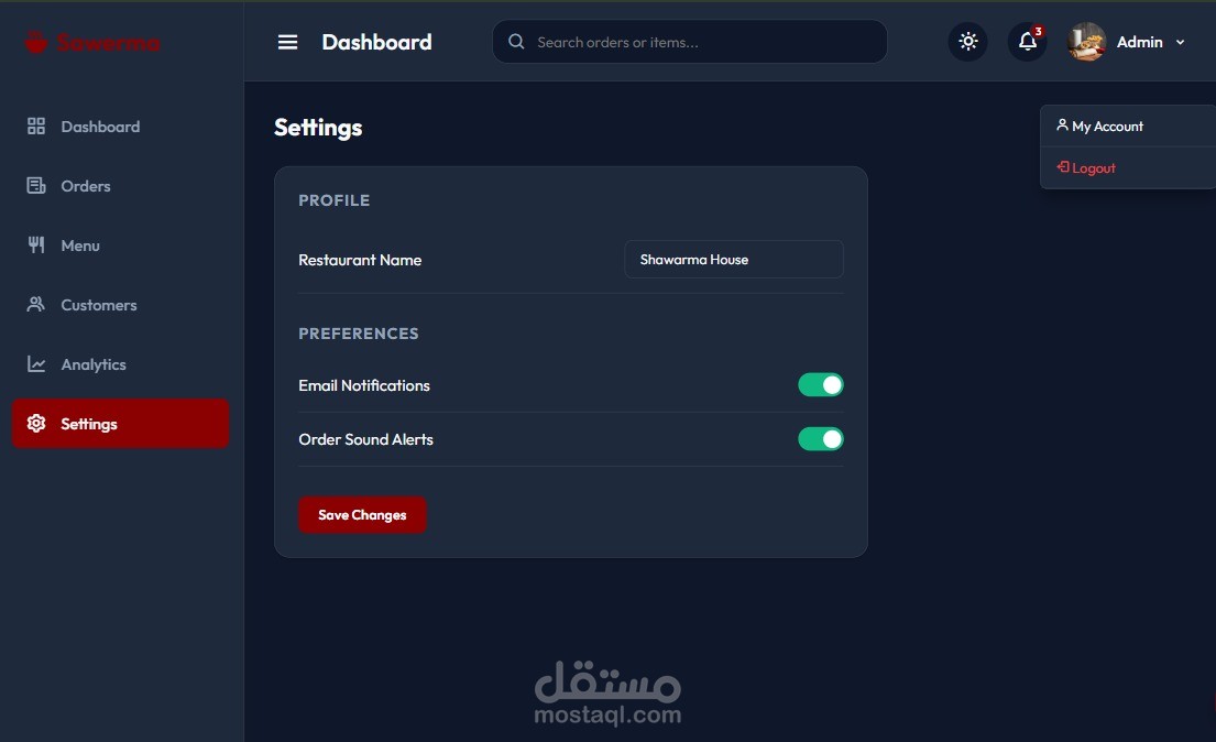 موقع لمطعم مطبق ك dashboard