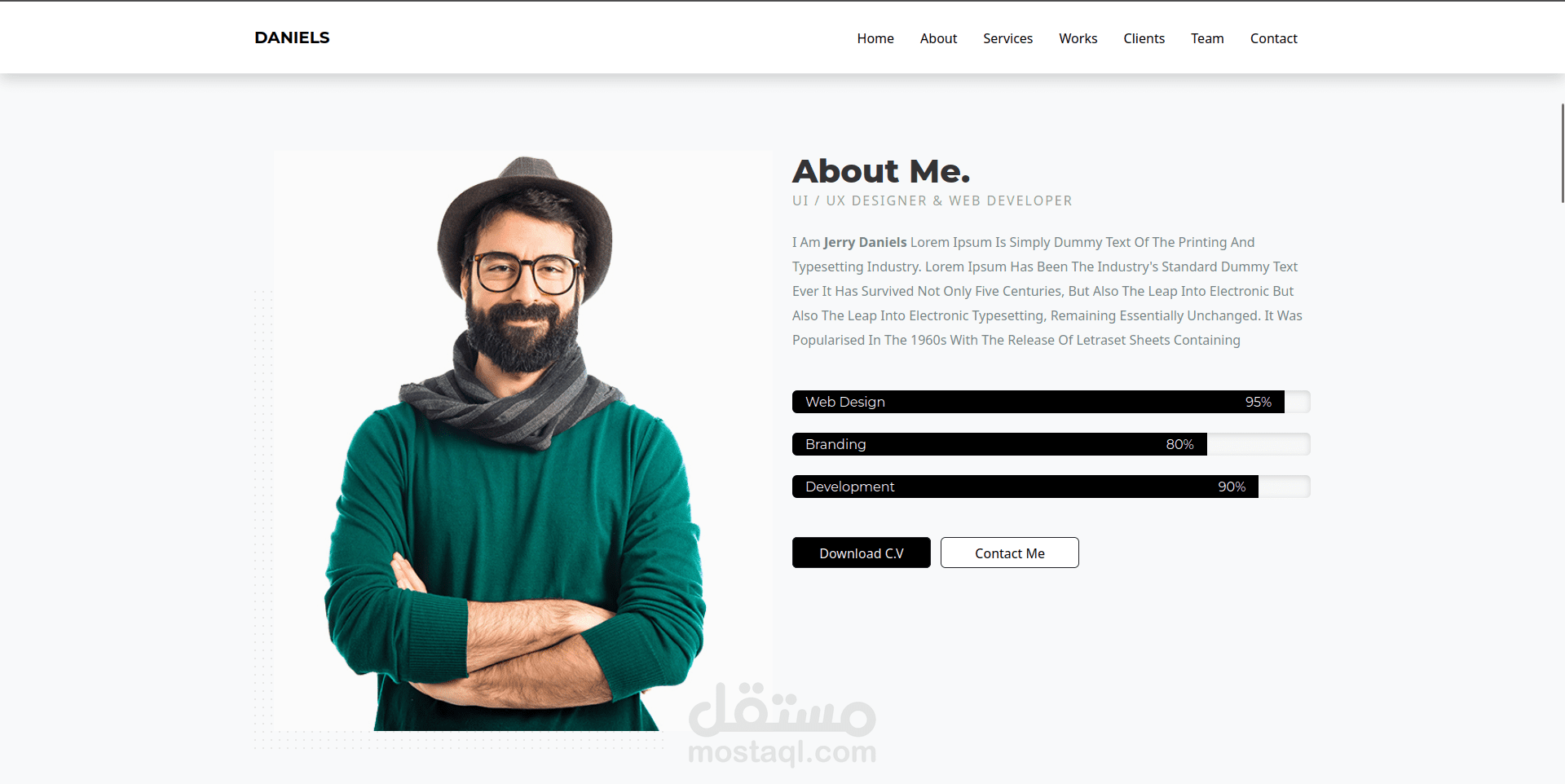 Animated Skills & Progress Visualization: Features customized progress bars to quantify technical expertise (Web Design, Branding, Development), providing an at-a-glance view of core strengths.