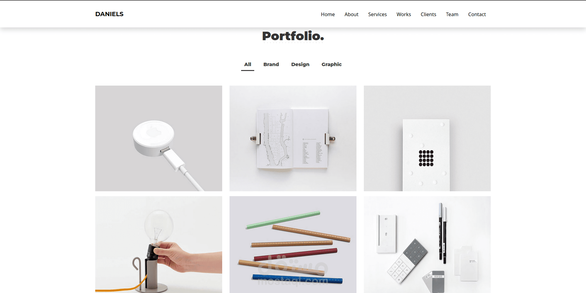 Interactive Portfolio Grid: A sophisticated gallery system with category filtering (Brand, Design, Graphic) and high-quality image overlays, allowing users to explore work samples by niche.