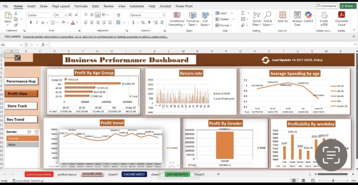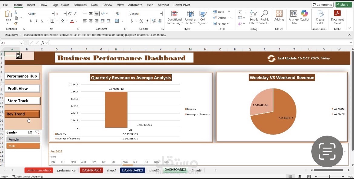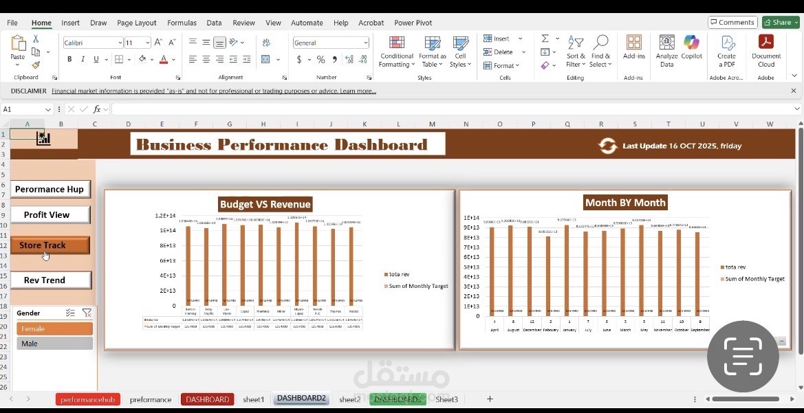Business Performance Dashboard built using Microsoft Excel. It serves as an interactive data visualization tool designed to help stakeholders monitor key performance indicators (KPIs) through multiple lenses.
