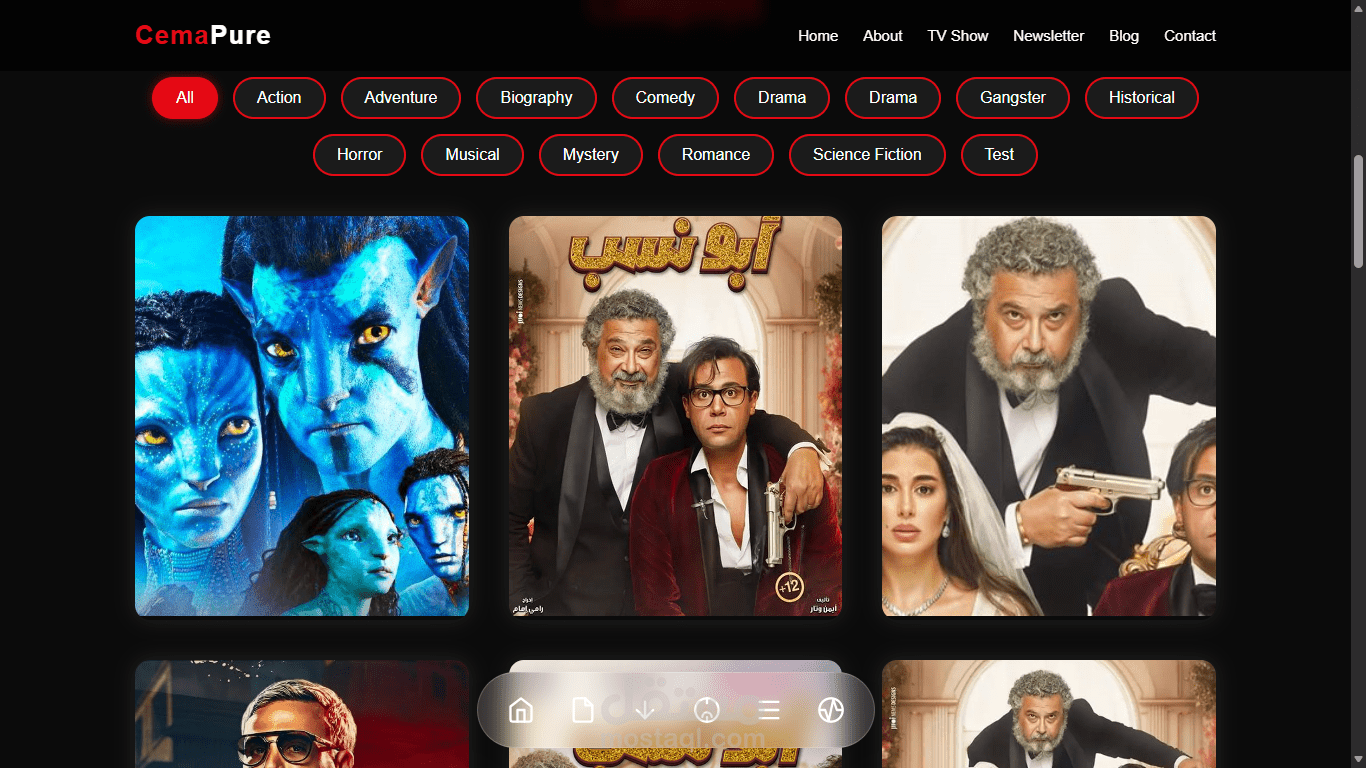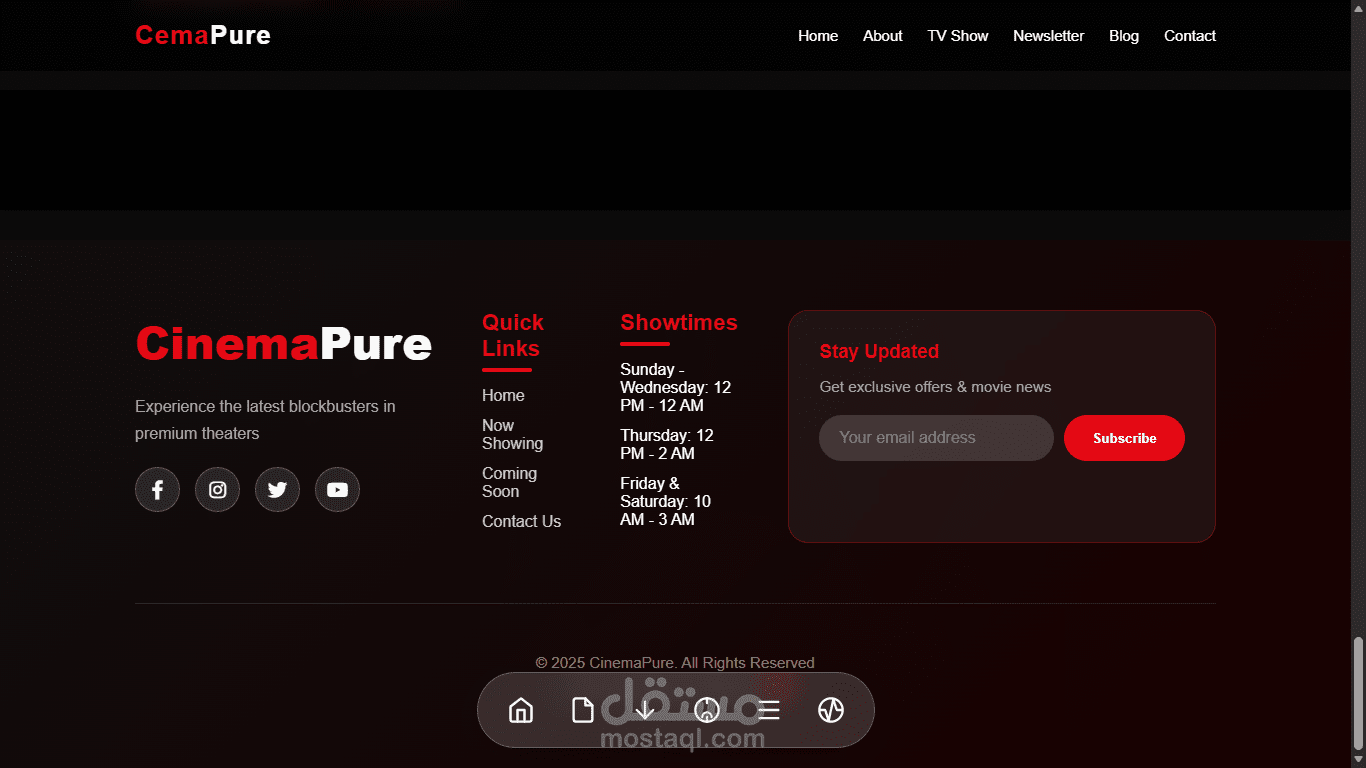 سيما بيور هو منصة متكاملة لحجز تذاكر السينما وادارة العروض السينمائية باحترافية تامة يعتمد المشروع على تقنيات اي اس بي دوت نت كور لتوفير نظام قوي وسريع يسمح للمستخدمين باستكشاف احدث الافلام والبحث عن دور السينما وحجز مقاعدهم بسهولة فائقة يتضمن المشروع لوحة تحكم متطورة للمديرين تسمح باضافة الافلام والممثلين وادارة التصنيفات والسينمات مع تكامل كامل لنظام مدفوعات سترايب لضمان عمليات دفع آمنة وسلسة يتميز التصميم بجمالية عصرية تدعم الوضعين المظلم والمضيء مع واجهات متجاوبة تضمن تجربة ممتعة على كافة الاجهزة يهدف سيما بيور الى تقديم حل تقني متكامل يجمع بين المتعة في التصفح والسهولة في الحجز والادارة المالية المنظمة