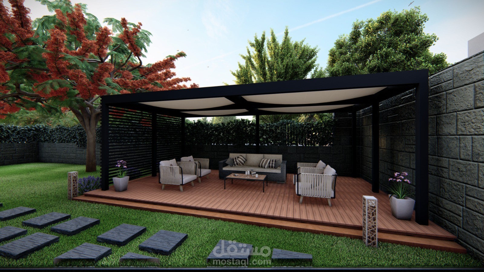 This project presents a modern villa garden design, featuring a comfortable outdoor seating area and lush greenery.
