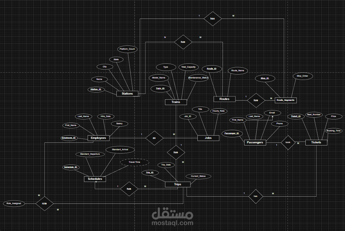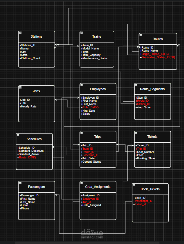 This schema is designed to manage the core operations of a railway network, covering logistics (routes and stations), operations (trains, schedules, and trips), workforce (employees and crew assignments), and commercial sales (passengers and ticketing).
