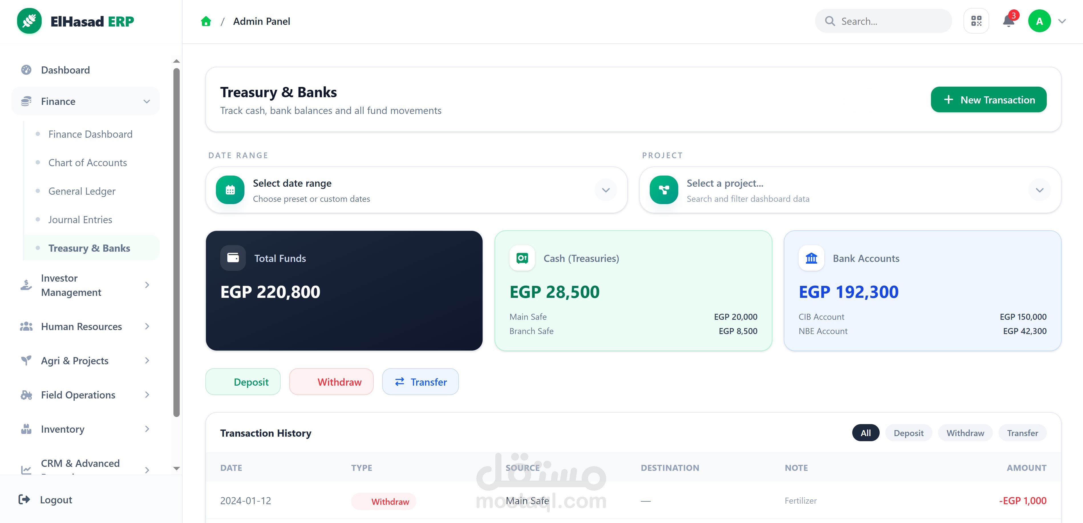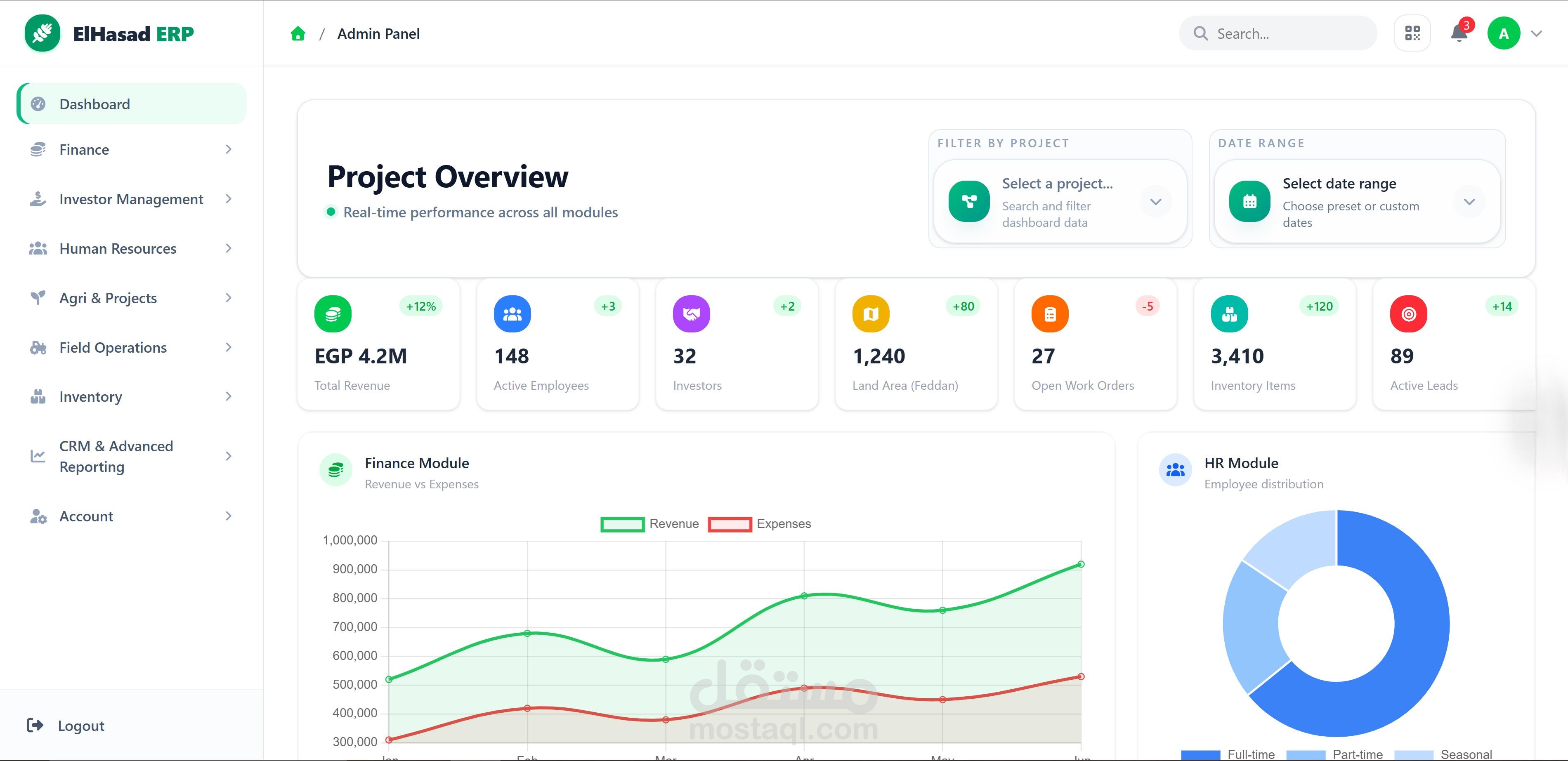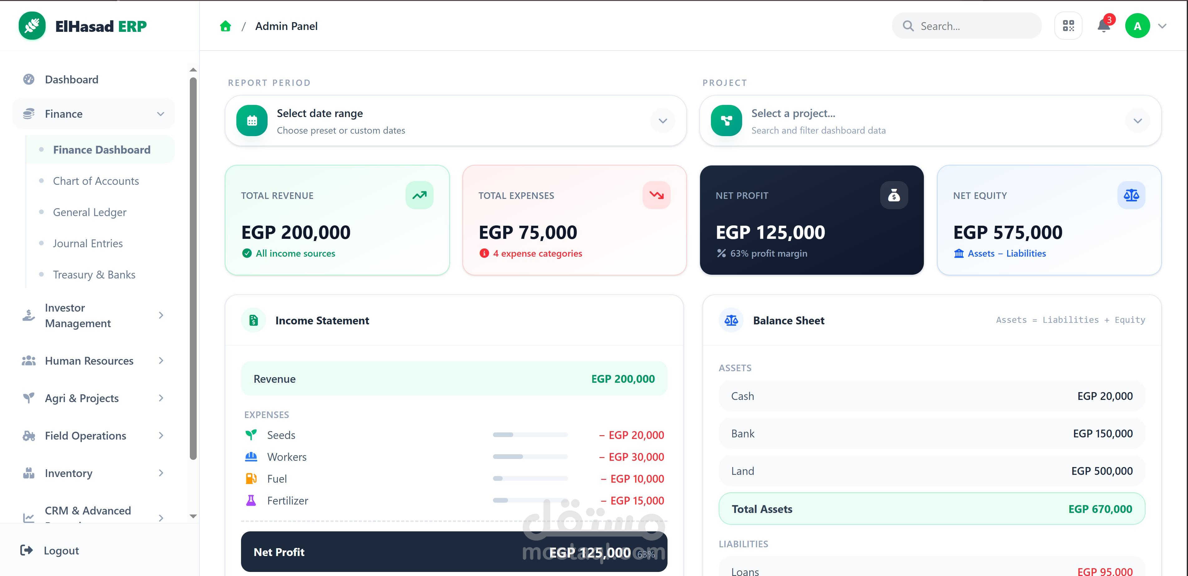منصة ERP وإدارة تشغيل متكاملة صُممت لتوحيد عمليات الشركة في واجهة واحدة سهلة وواضحة، بحيث تغطي الإدارة المالية، الموارد البشرية، المخزون، إدارة العملاء، العمليات الميدانية، إدارة الأنشطة الزراعية، والمستثمرين.