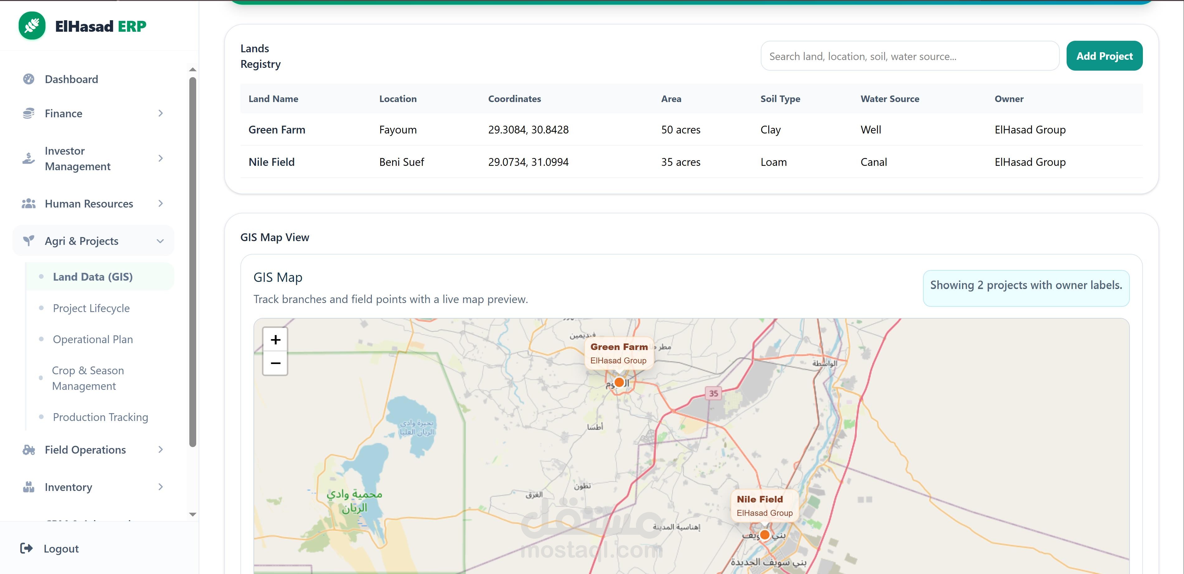 أقسام متخصصة لإدارة المالية، HR، المخزون، CRM، العمليات الزراعية، والعمليات الميدانية.