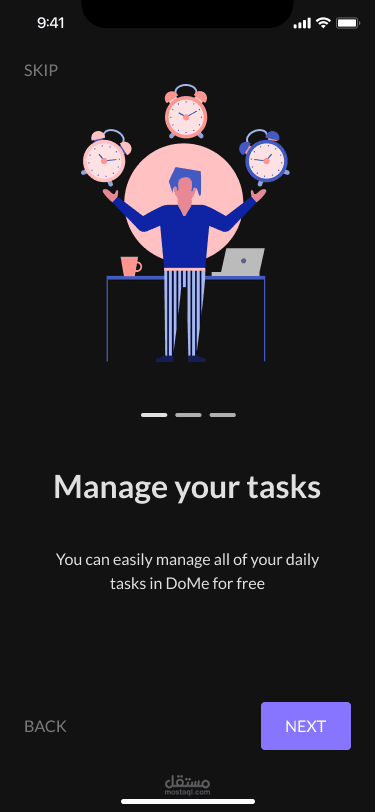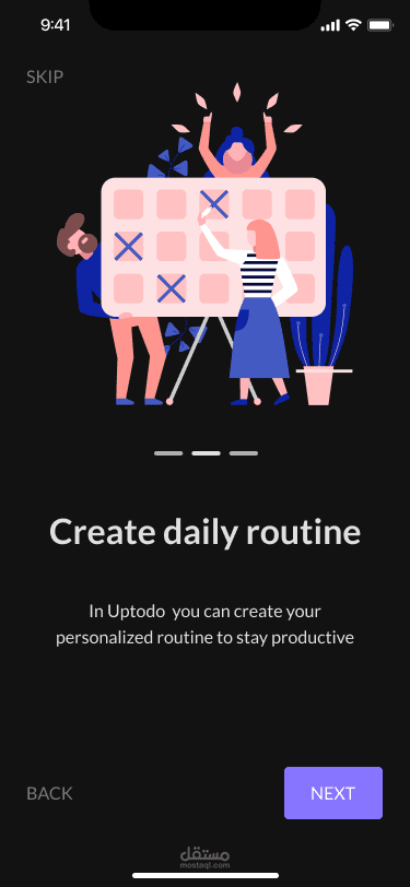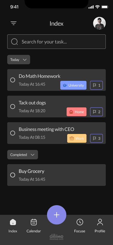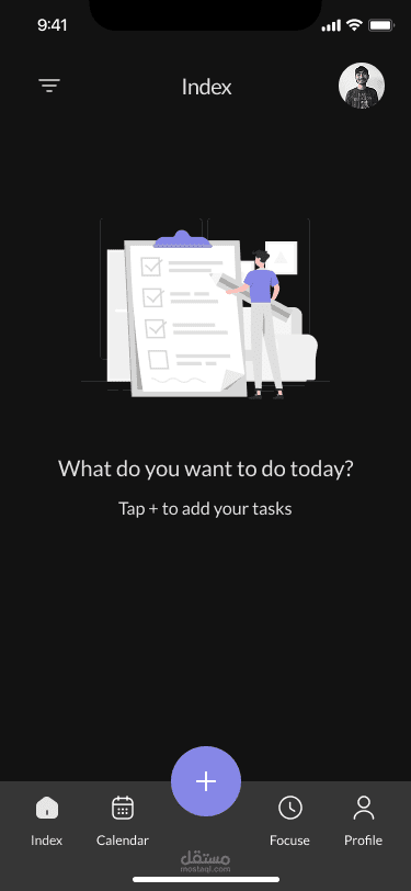 نوع العمل: تطوير تطبيق هاتف متكامل لإدارة المهام اليومية، يعتمد على تحويل تصميم واجهات (UI/UX) احترافي ومفصل من Figma إلى تطبيق تفاعلي عالي الأداء.