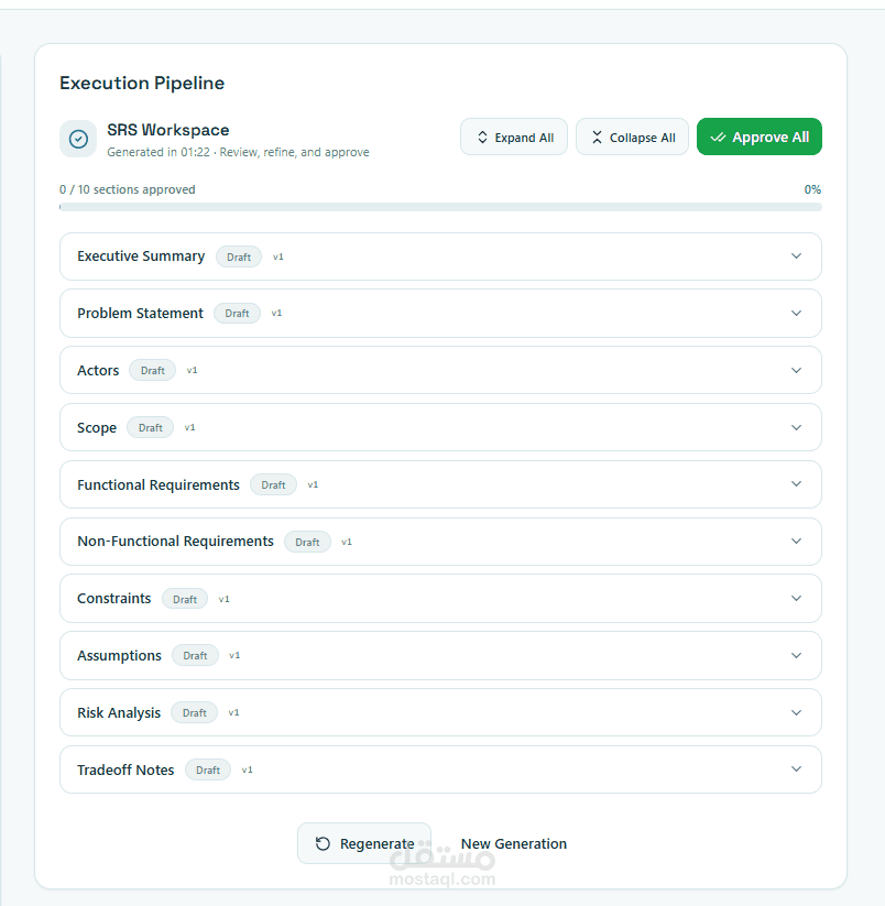 Each section (e.g., Scope, FRs, Risks) is generated independently