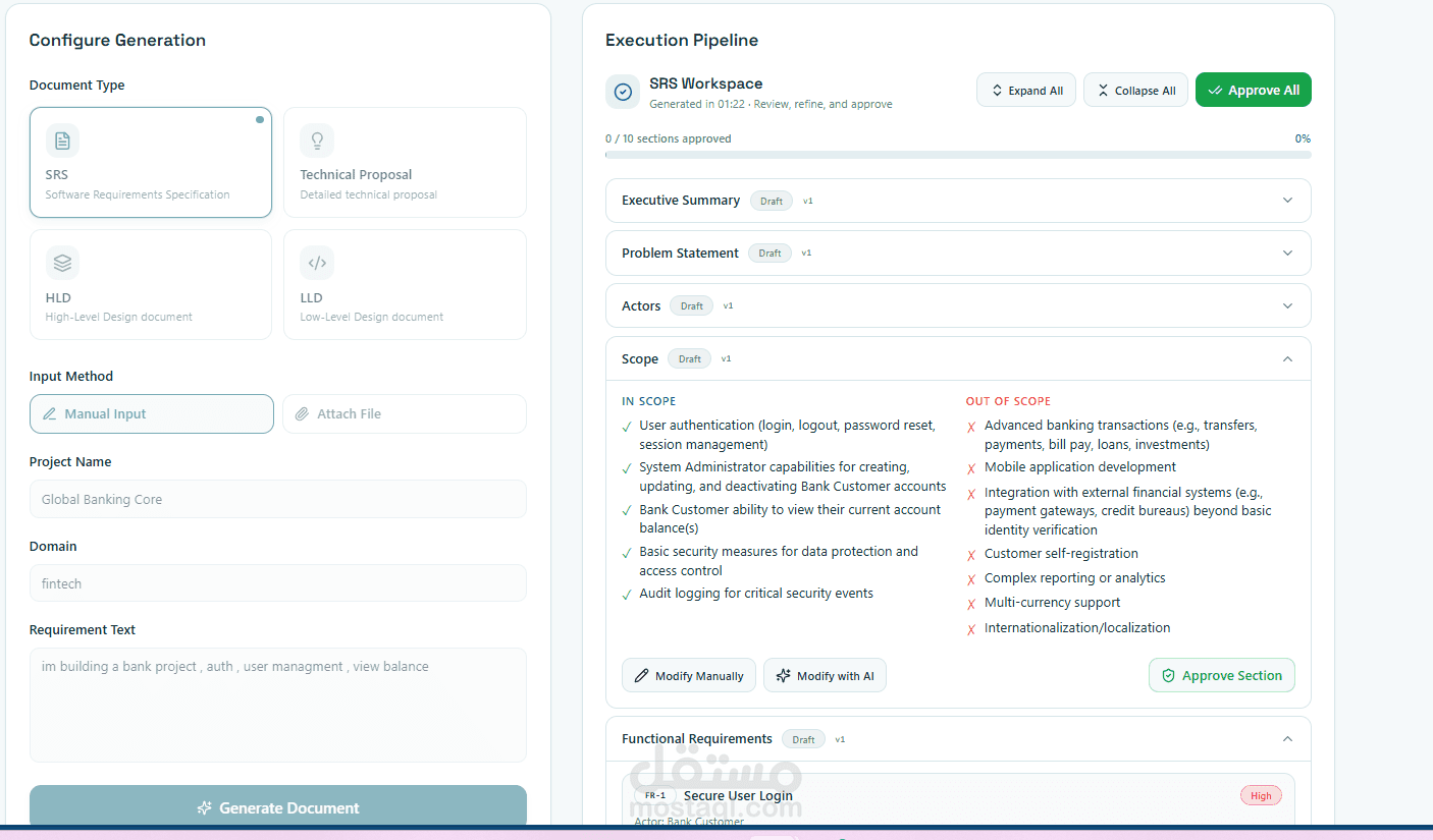 Multi-document transformation pipeline (SRS → Proposal → HLD → LLD)