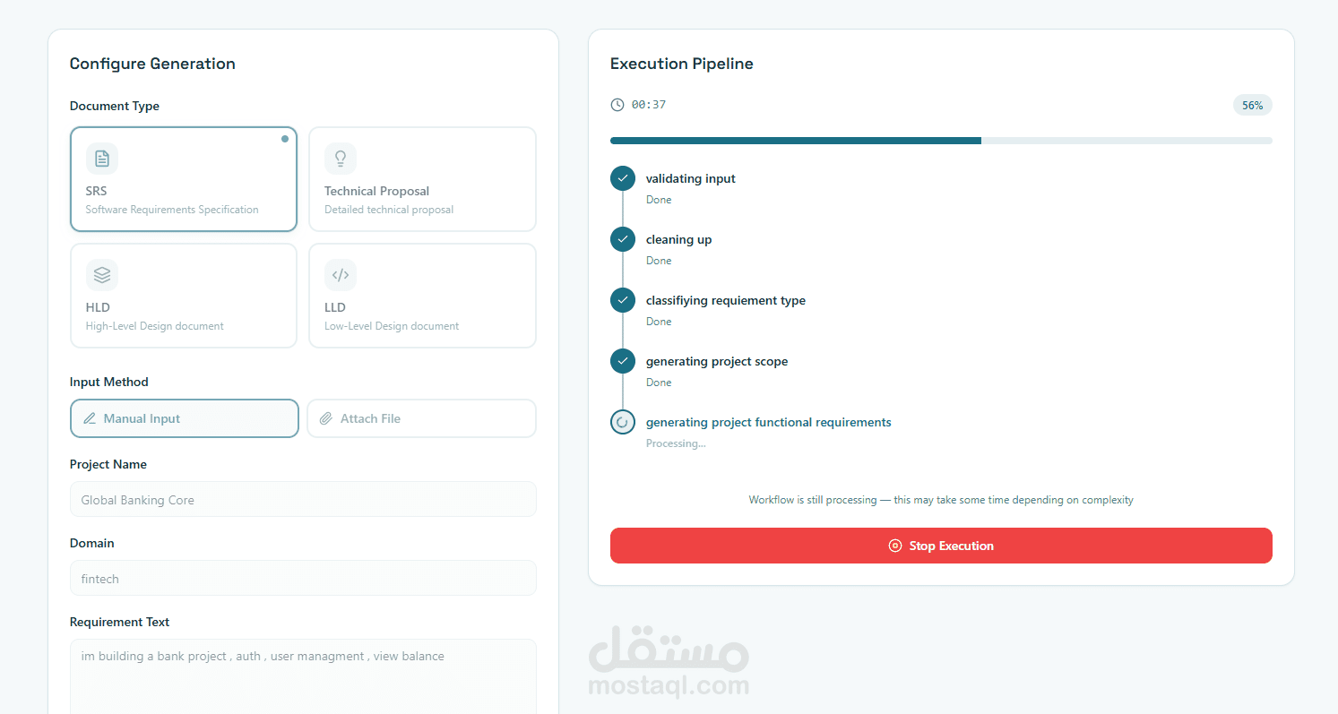 I designed and built an AI-powered Document Engineering Platform that transforms raw, unstructured user input into production-ready software engineering deliverables, including: