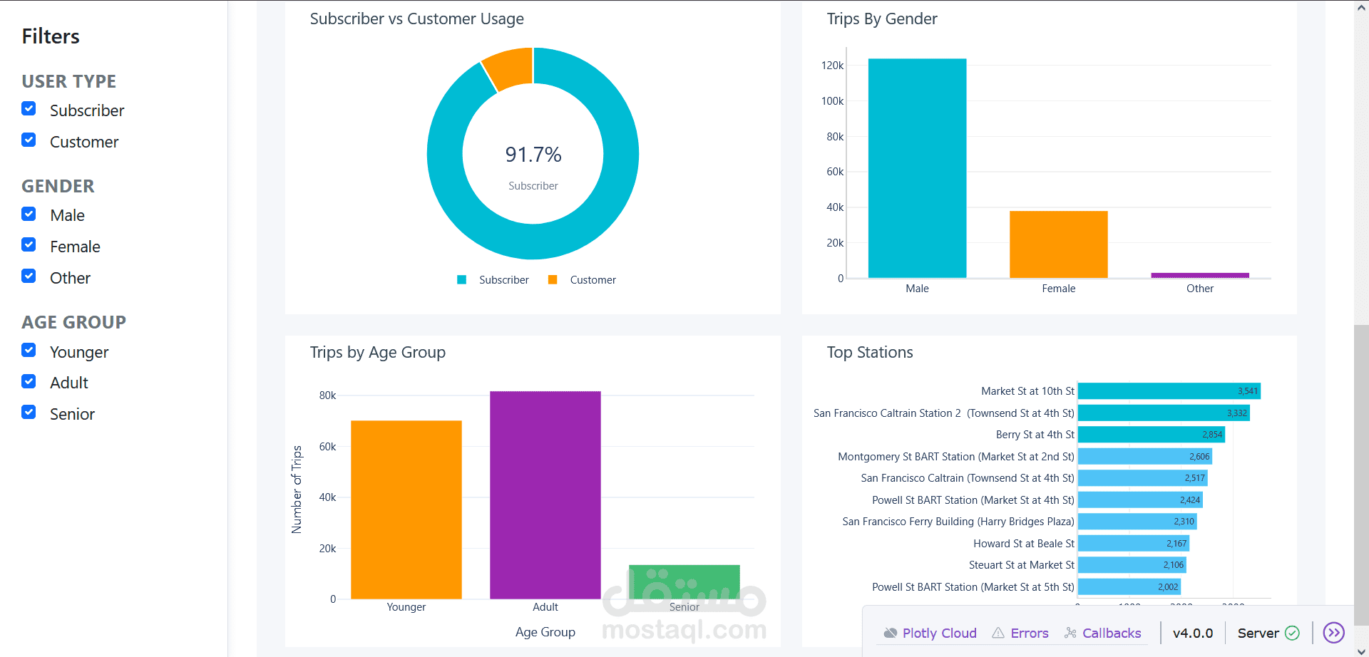 هذا المشروع عبارة عن لوحة تحليلات بيانات تفاعلية لنظام مشاركة الدراجات Ford GoBike، تم تصميمها وتطويرها باستخدام Python وDash وPlotly. تهدف اللوحة إلى تقديم رؤية شاملة في الوقت الفعلي لأداء النظام من خلال تصورات ديناميكية وبطاقات مؤشرات الأداء الرئيسية (KPI).