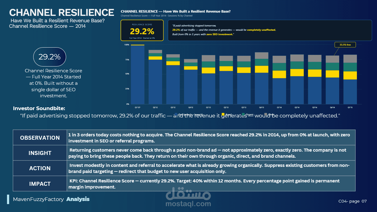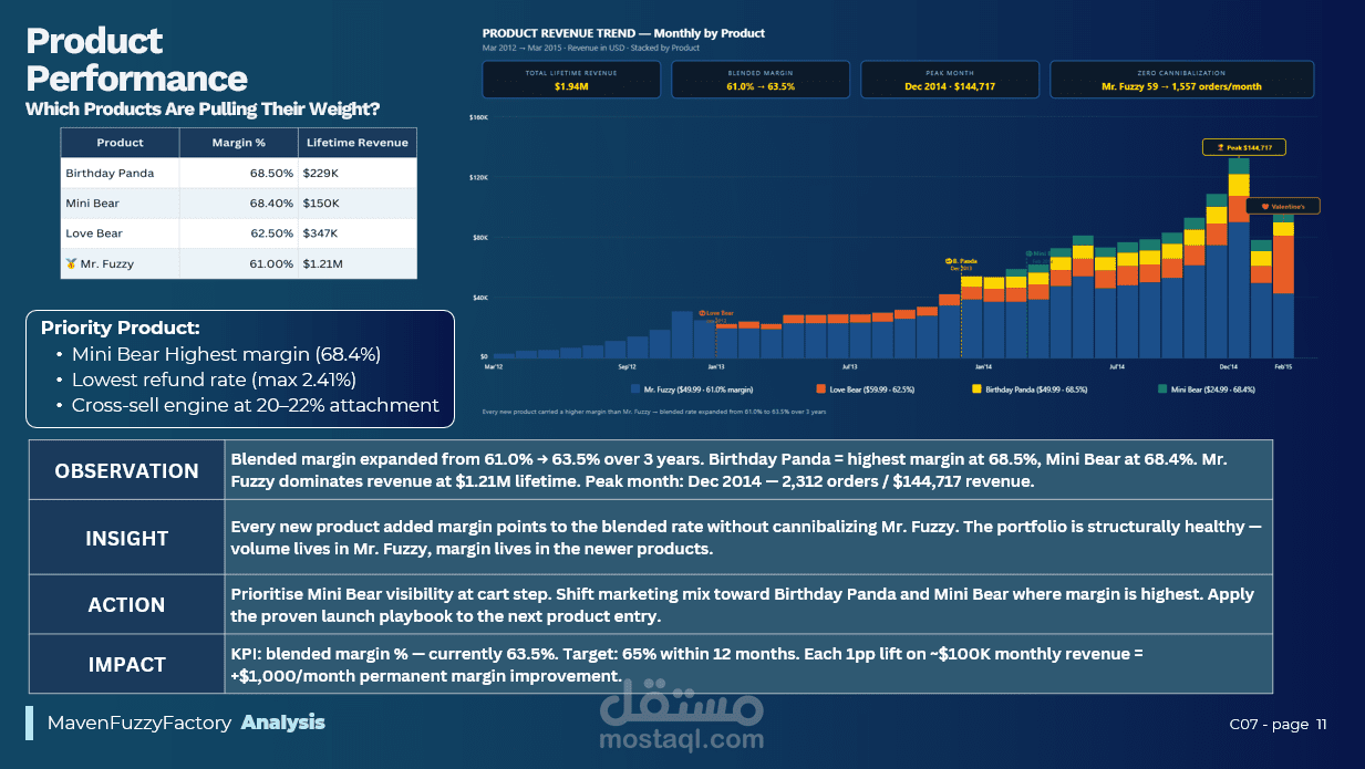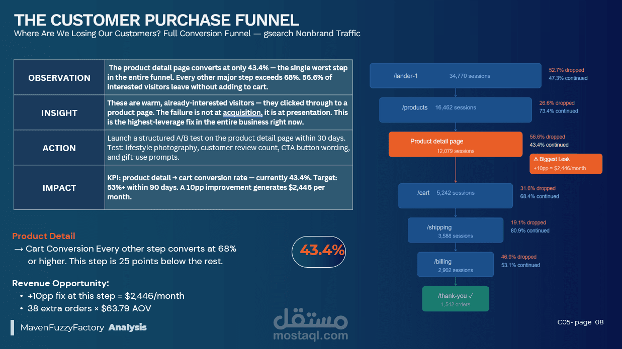 تحليل 3 سنوات من بيانات متجر إلكتروني (472,871 session و 32,313 طلب) ضمن مشروع Hackathon احترافي لبرنامج DEBI. اكتشاف اختناق في صفحة المنتج بمعدل تحويل 43.4% مقارنة بـ 68%+ في باقي الصفحات، مع تحديد تأثير مالي بـ 2,446 دولار شهرياً لكل 10% تحسين. تضمن المشروع A/B testing وتحليل cross-sell وخارطة طريق استراتيجية بقيمة 100,000 دولار. المشروع حقق المركز الثالث في المسابقة.
