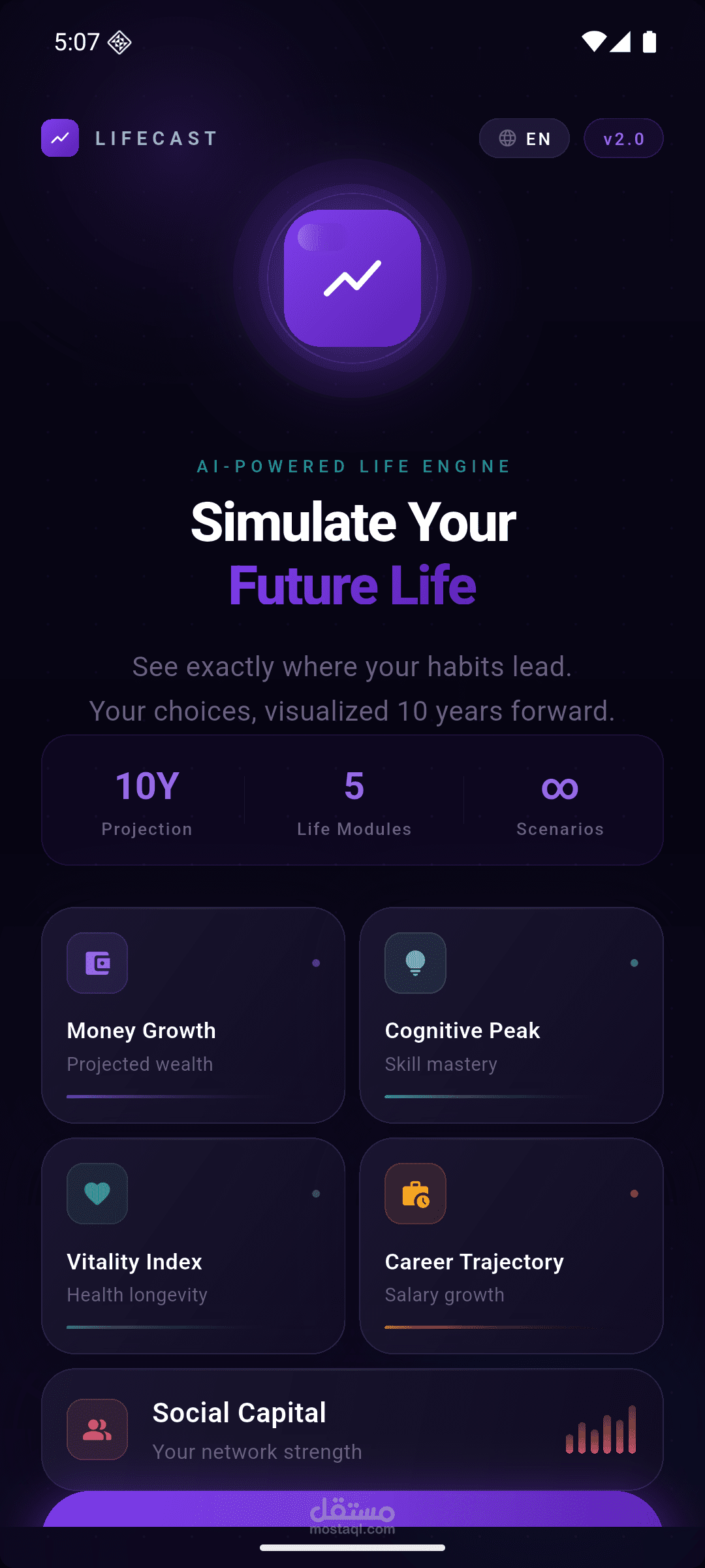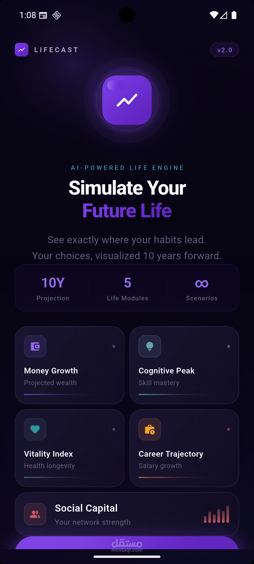 **Future Life** is a data-driven Flutter app that simulates how your daily habits today will shape your life over the next 10 years — financially, physically, intellectually, and socially.