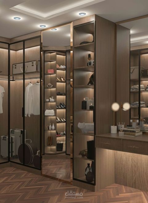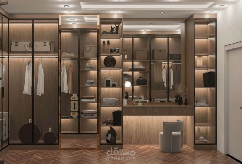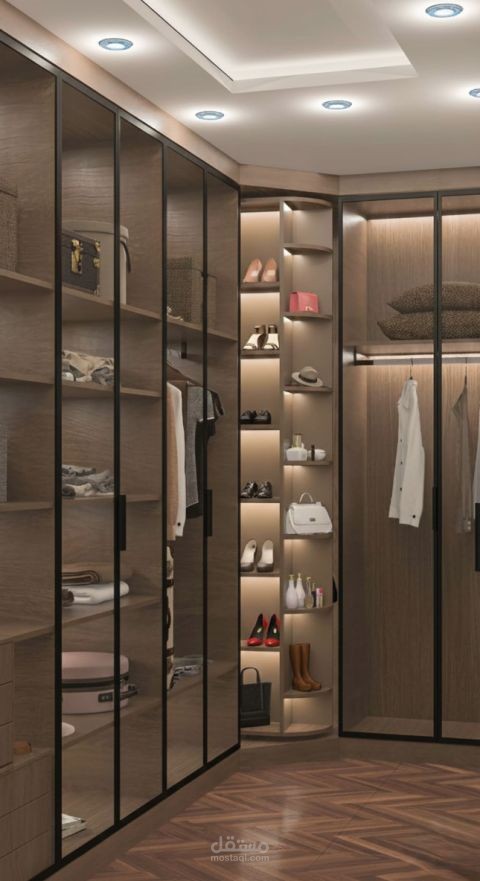 A rhythmic display of glass-fronted wardrobes, showcasing internal illumination and organized storage modules.