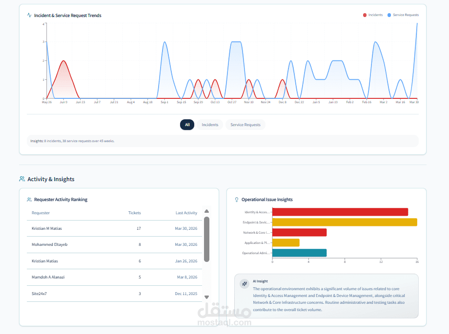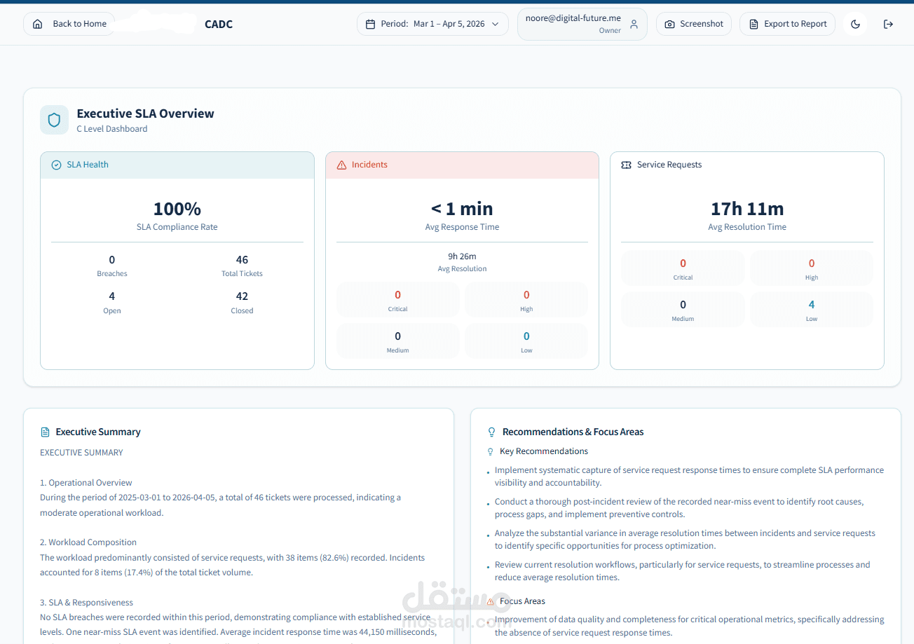 At its core, the system combines data aggregation pipelines, SLA analytics, and AI-assisted insights generation to ensure both visibility and operational excellence.
