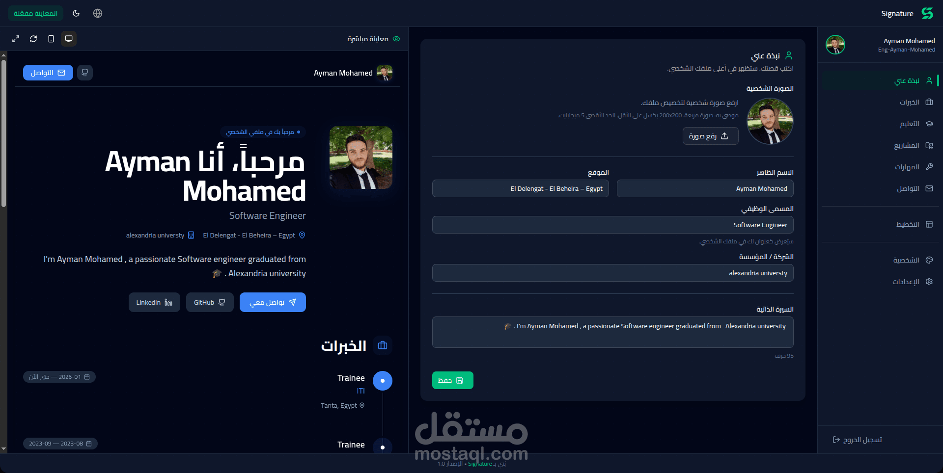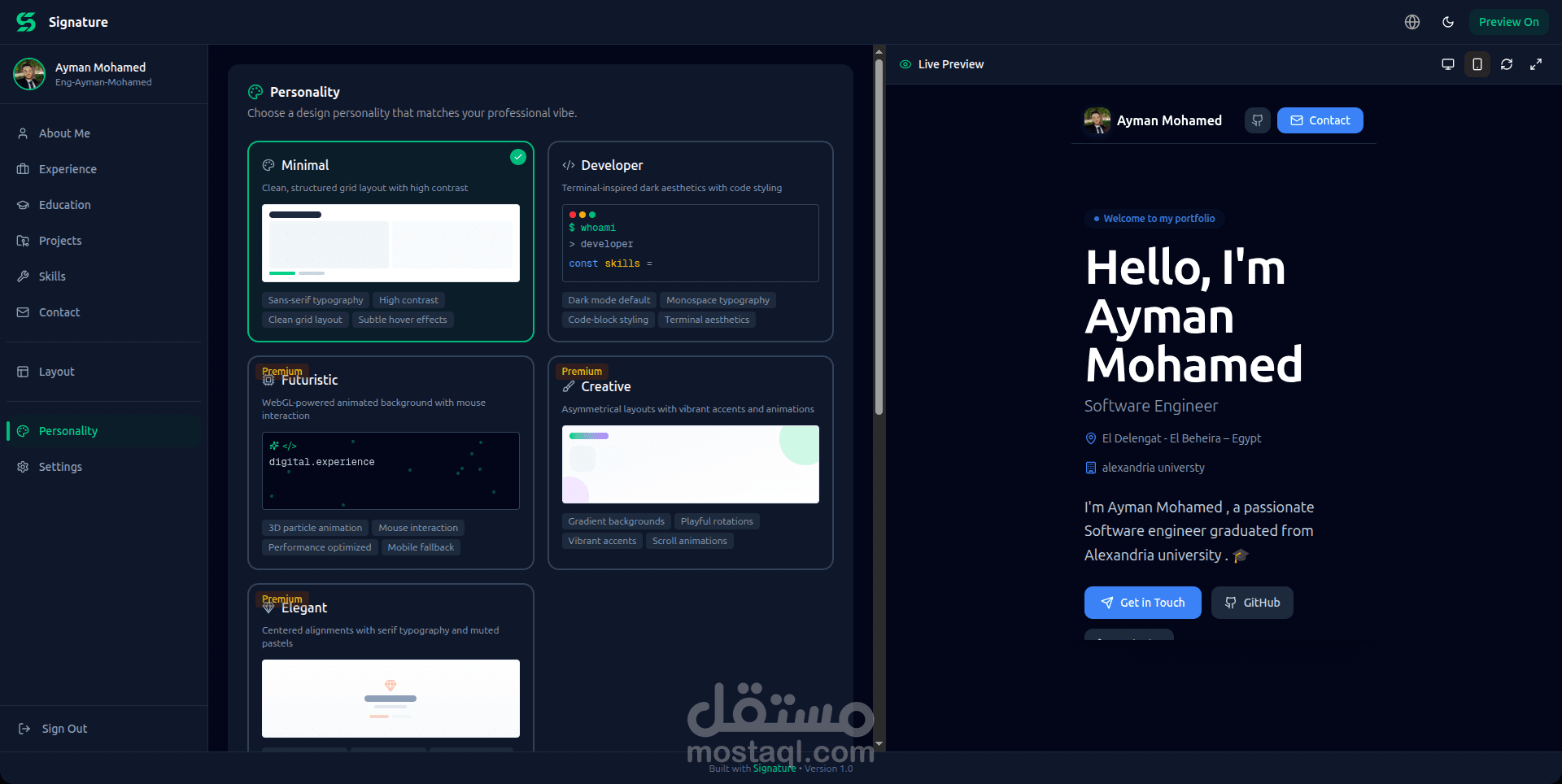 مشروع Signature هو أداة (Full-stack) عالية الأداء مصممة خصيصاً للمبرمجين والمبدعين الساعين للتميز. يتيح النظام بناء حضور رقمي احترافي خلال دقائق، مع توفير 5 قوالب بصرية فريدة (Personalities) تتنوع بين التصاميم المستوحاة من واجهات البرمجة (Terminal) والتصاميم المستقبلية ثلاثية الأبعاد، مما يضمن ابتعاد ملف أعمالك عن القوالب التقليدية المكررة