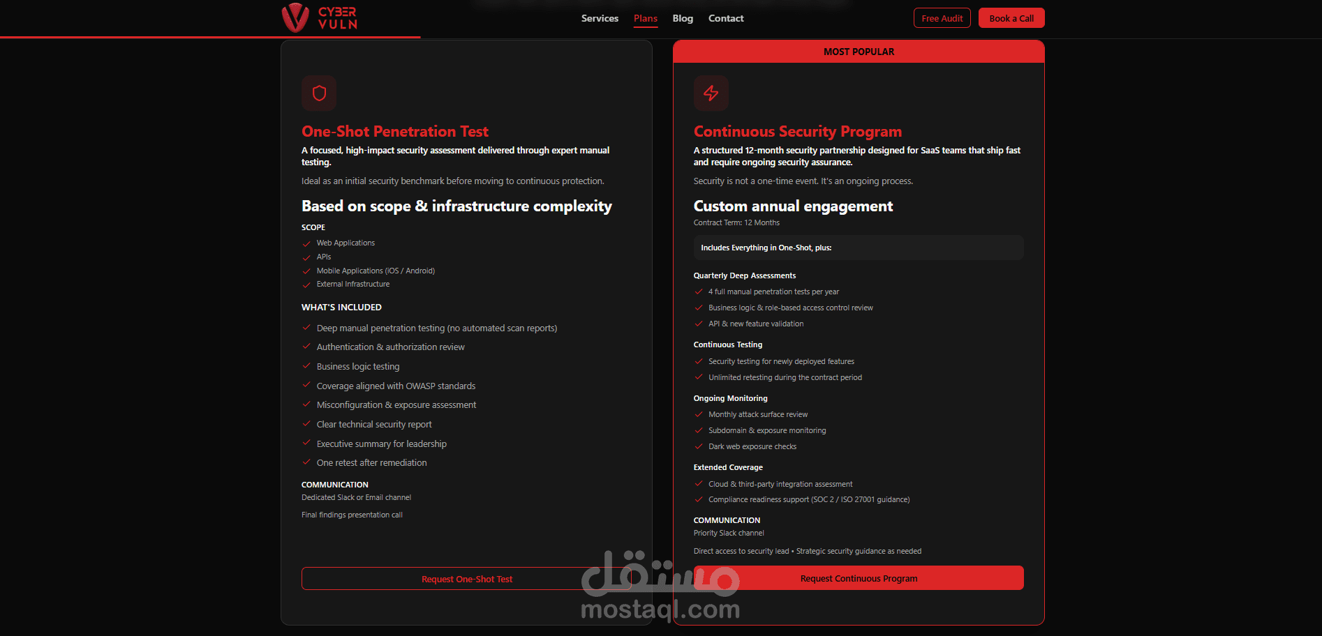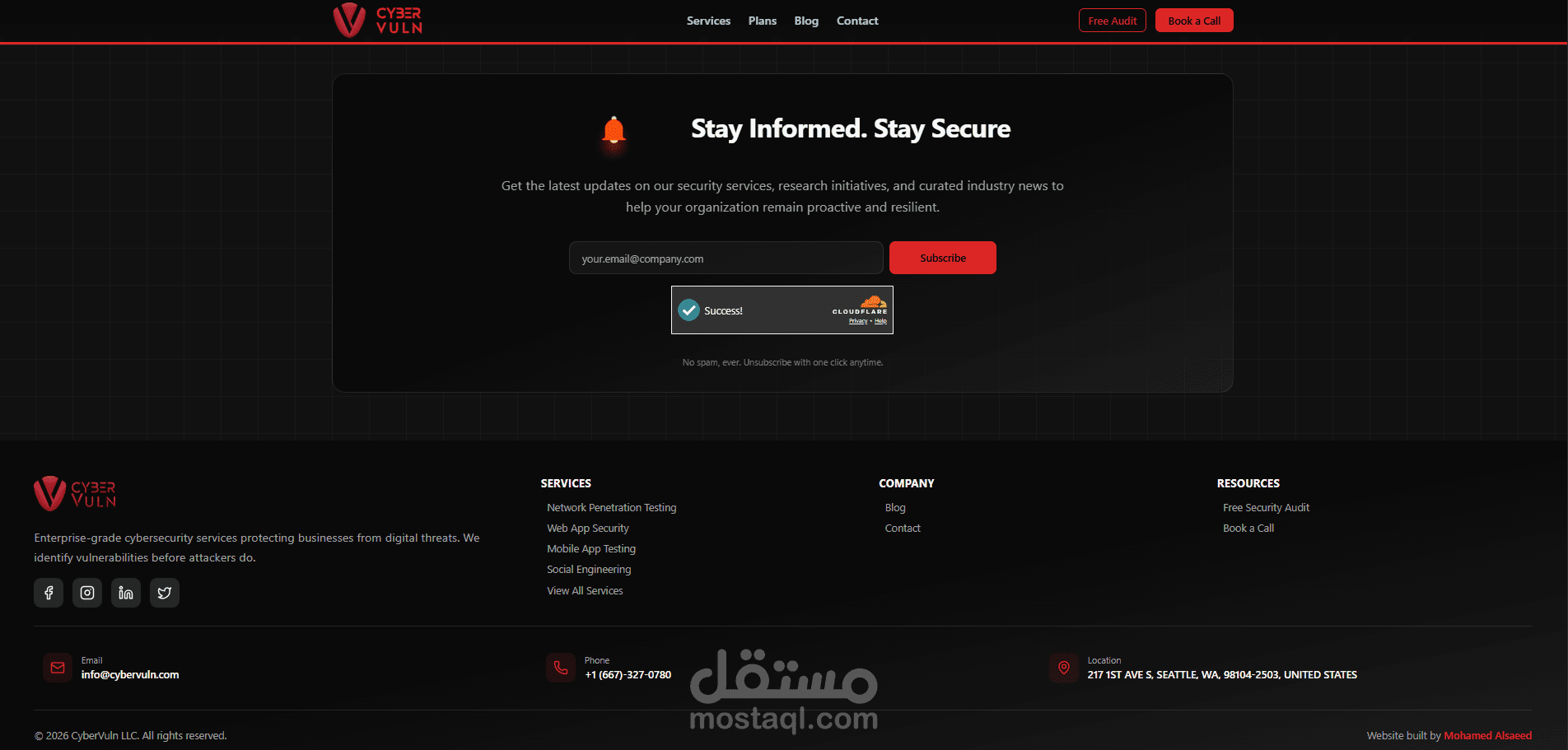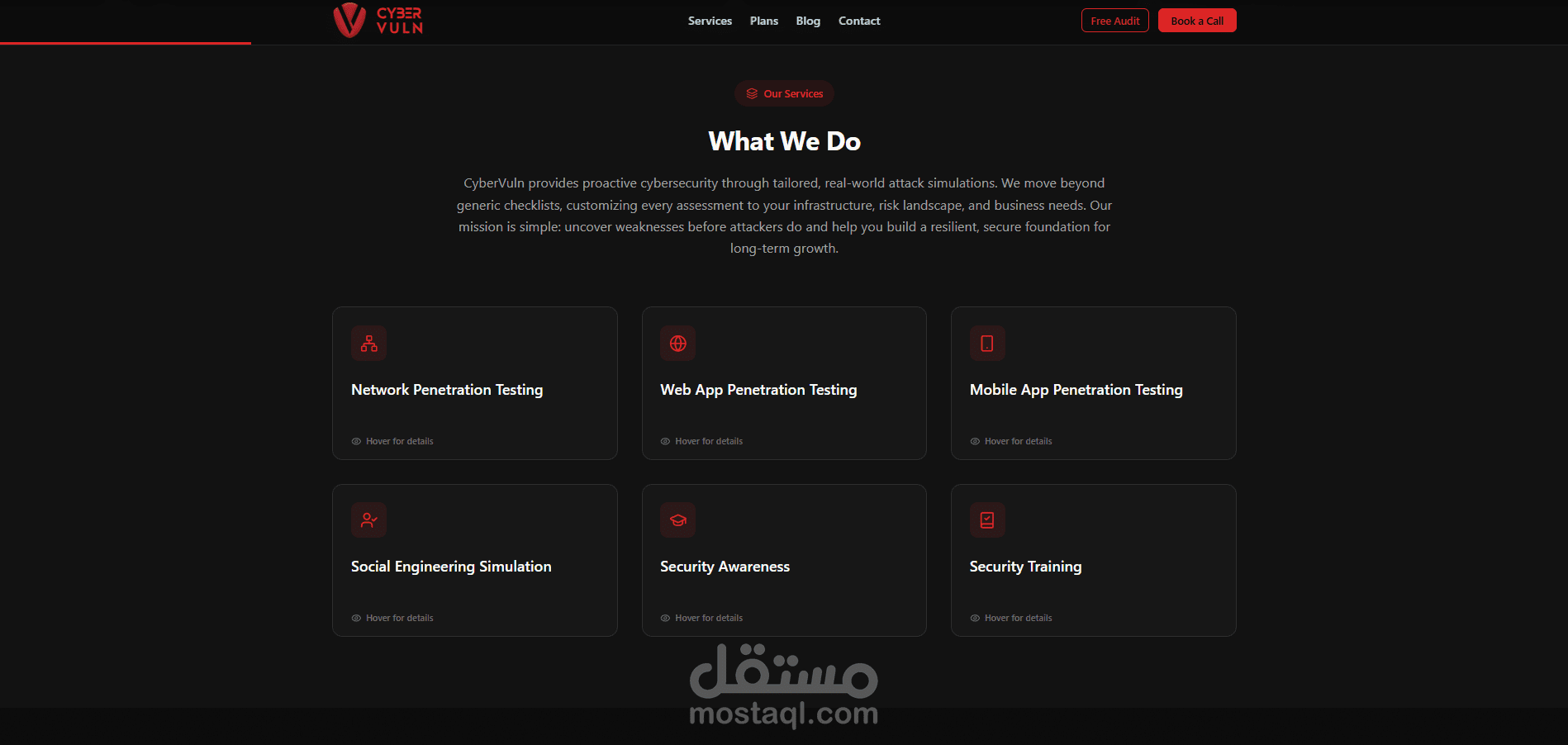 يوفر الموقع صفحات متعددة تشمل عرض الخدمات، خطط الأسعار، طلب استشارة، طلب فحص أمني مجاني، مدونة تقنية، ونماذج تواصل متقدمة. كما تم ربطه مع نظام إدارة محتوى (Sanity) لإدارة ونشر المقالات بشكل ديناميكي، بالإضافة إلى Supabase لتخزين بيانات العملاء والطلبات.