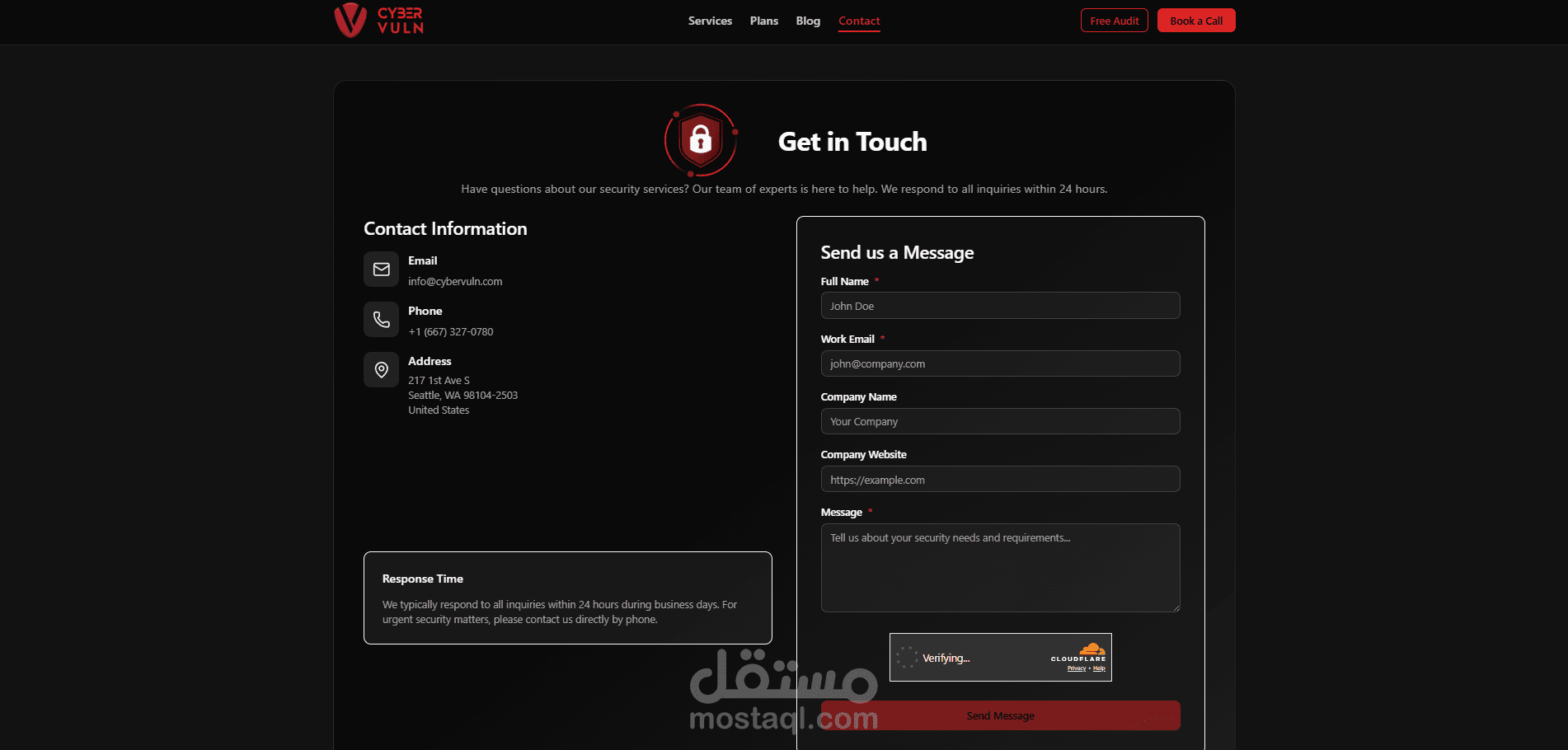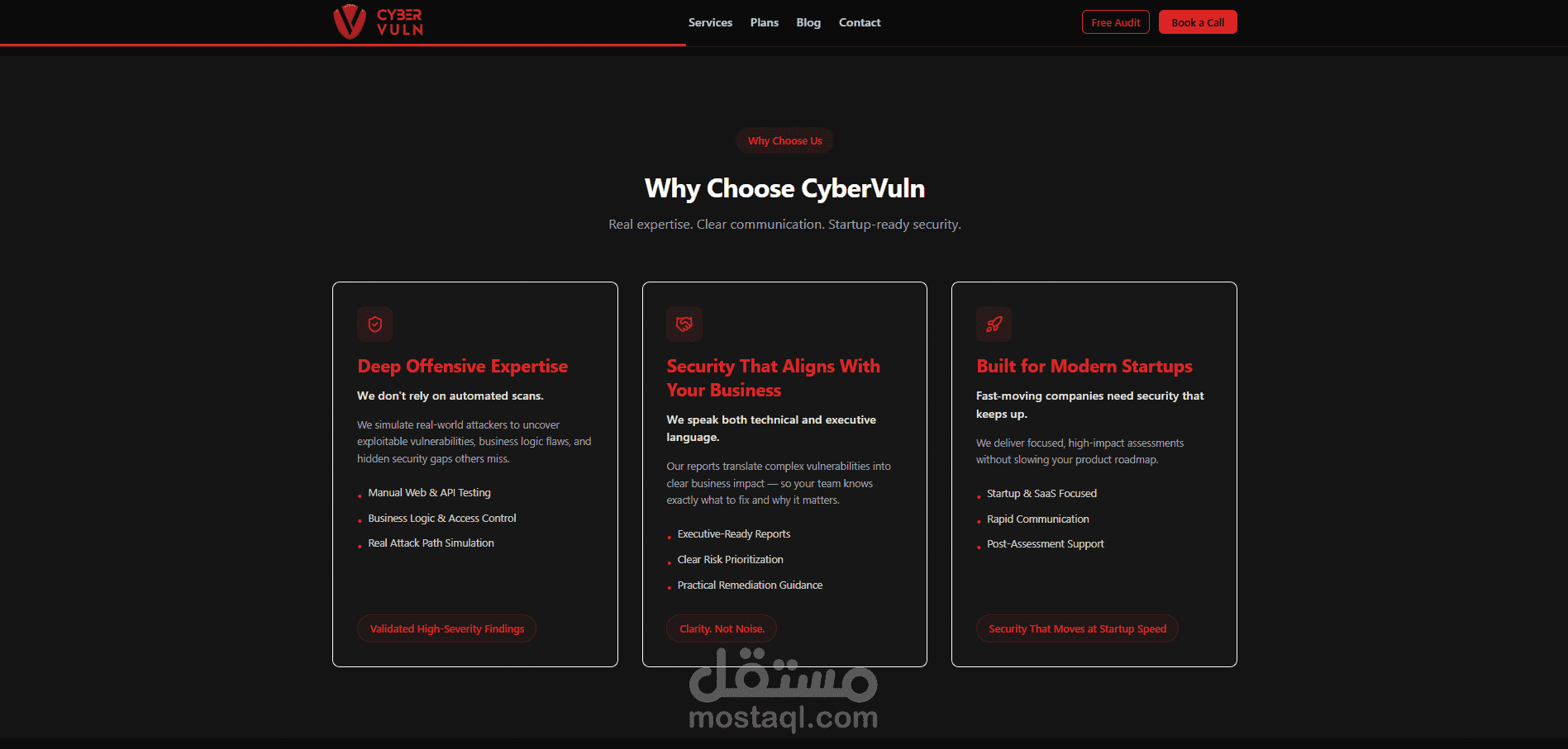 موقع احترافي لشركة CyberVuln في مجال الأمن السيبراني، تم تطويره باستخدام Next.js وTypeScript وTailwind CSS بهيكلية حديثة (Feature-Based Architecture) تضمن قابلية التوسع وسهولة الصيانة.