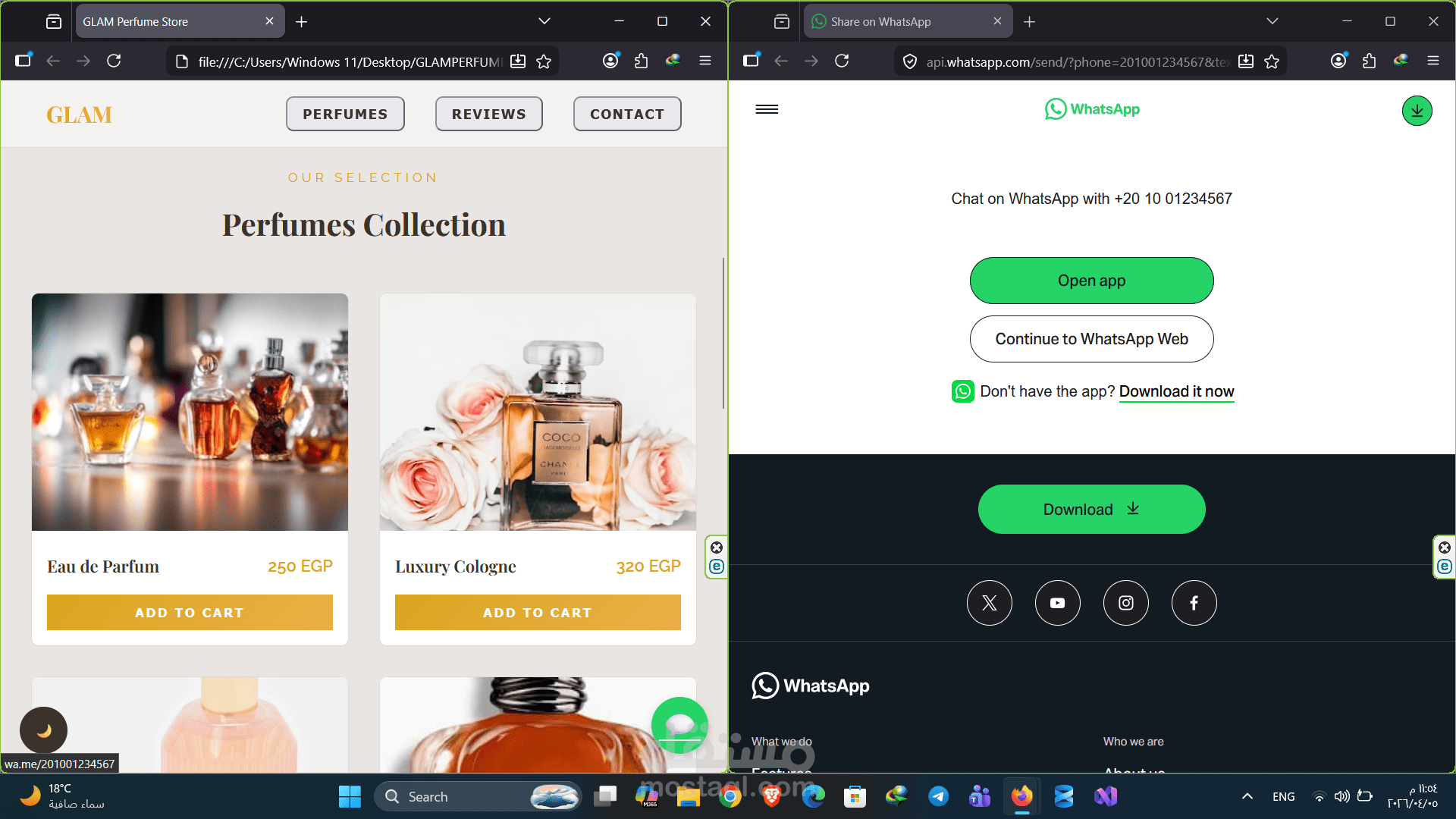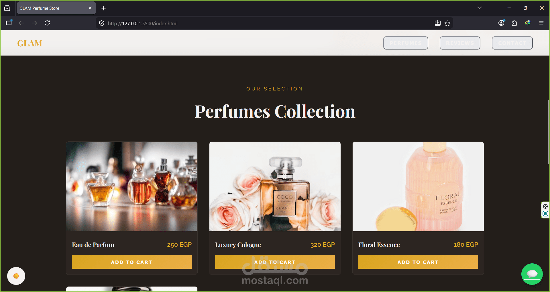 Perfume Menu displaying product images, names, prices, and “Add to Cart” buttons.