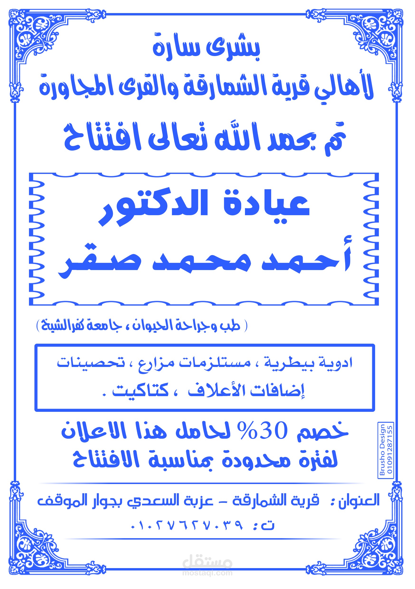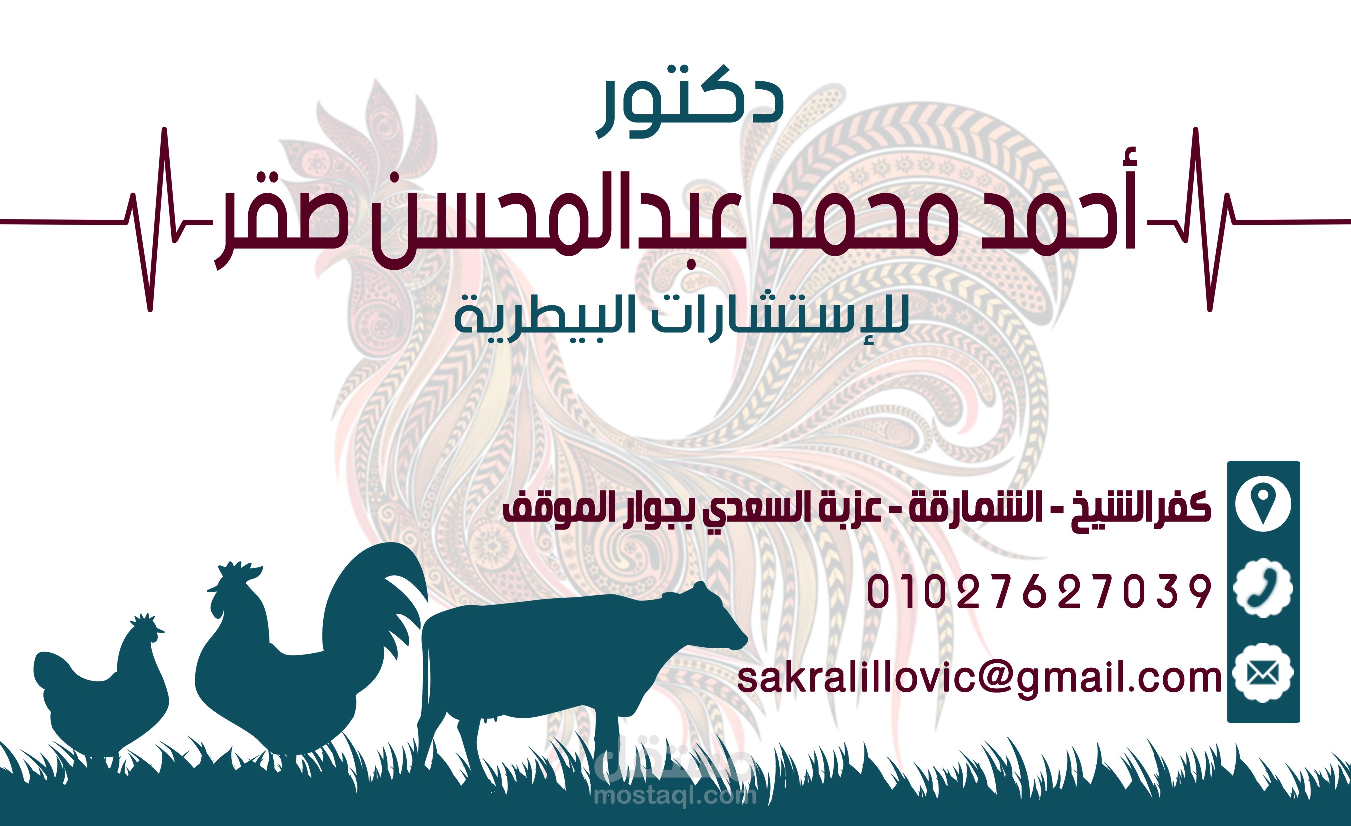 كارت شخصي لطبيب بيطري يحتوي على معلومات الطبيب بالاضافة لرسومات تبرز التخصص و عمل اعلان دعائي للطباعة والنشر