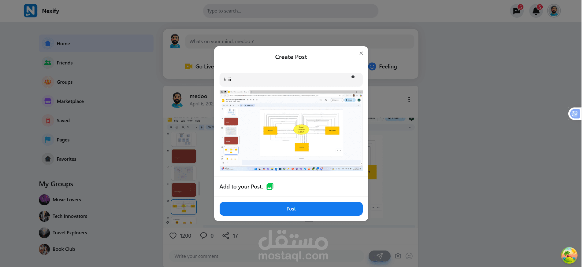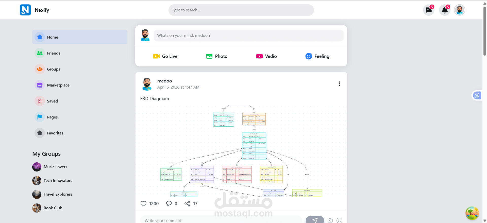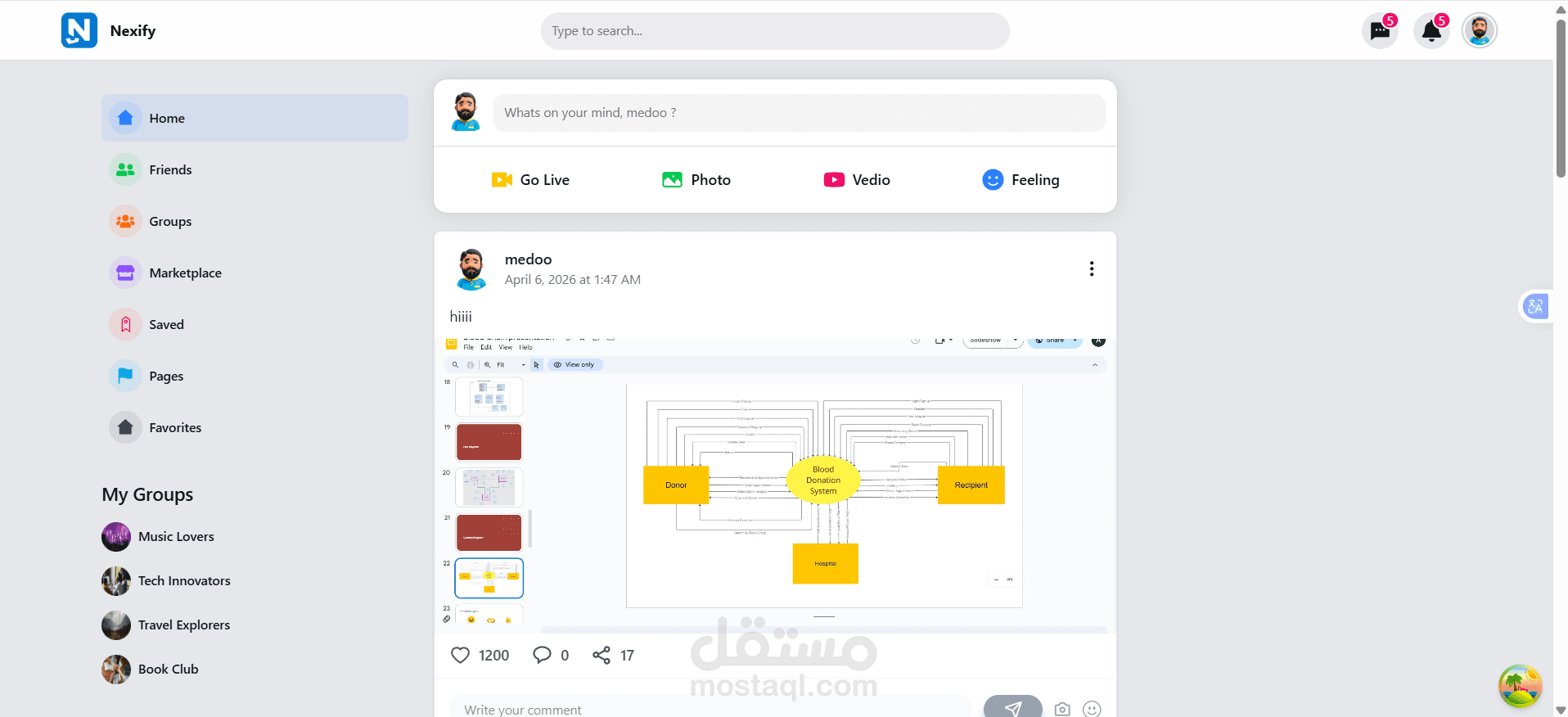 قمت بتطوير منصة تواصل اجتماعي متكاملة باستخدام مكتبة React، مع الاعتماد على تقنيات حديثة لتحسين الأداء وتجربة المستخدم.