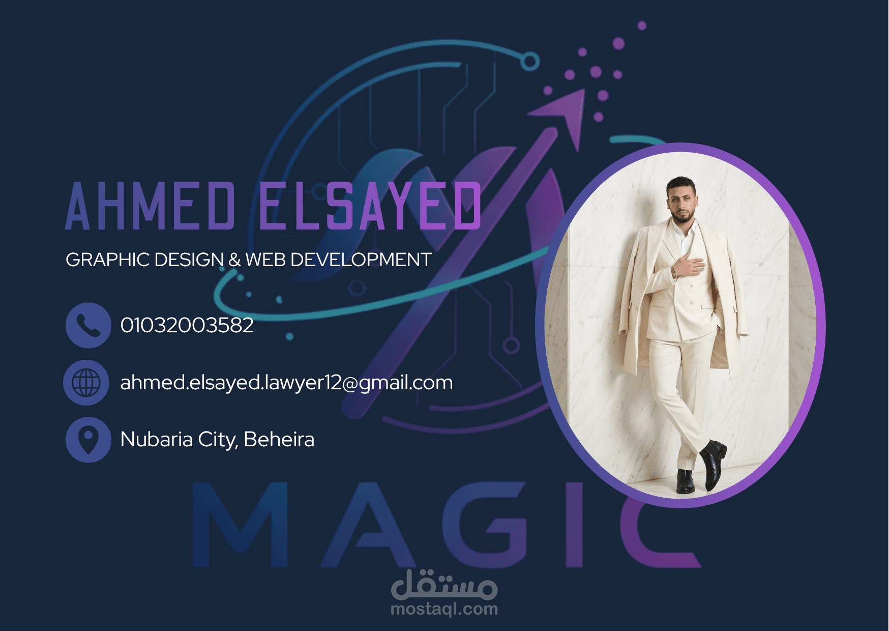 قمتُ بتصميم هذه البطاقة الشخصية كجزء من هوية بصرية متكاملة لعلامة MAGIC، مع التركيز على إبراز الجانب الاحترافي والتقني بأسلوب عصري وجذاب.