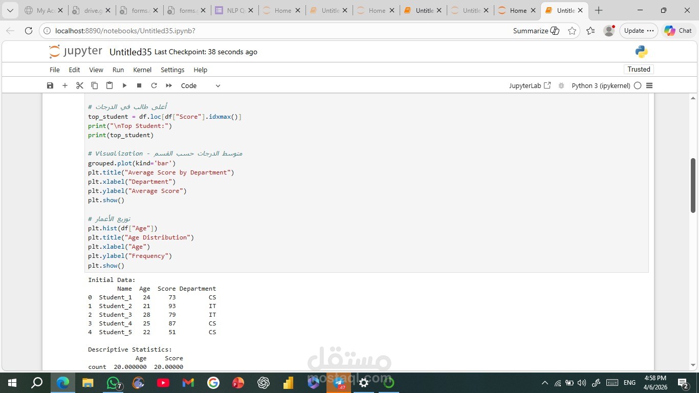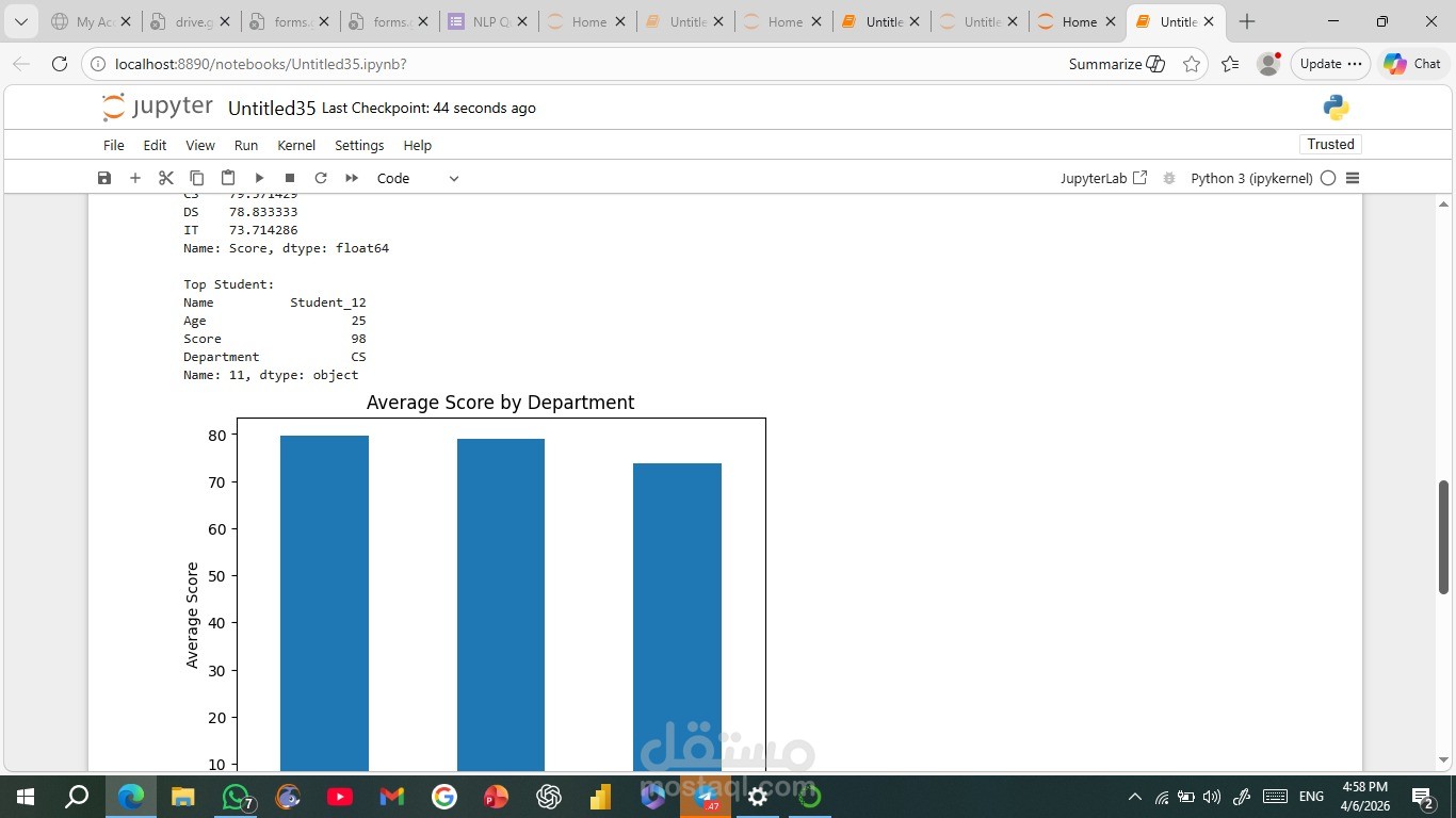 A Python-based data analysis project that generates a synthetic dataset and performs data exploration, statistical analysis, and visualization. The project includes grouping, aggregation, and extracting insights such as averages and top records, along with visual representations using Matplotlib. The code is clean, modular, and demonstrates core data analysis techniques using Pandas and NumPy